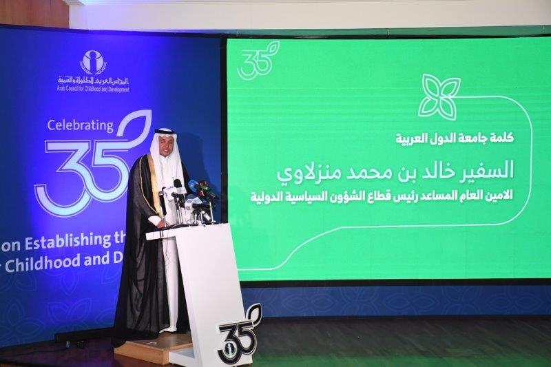 وفي كلمة الأمين العام لجامعة الدول العربية معالي السيد أحمد أبوالغيط ،التي القاها نيابة عن معاليه سعادة السفير خالد بن محمد منزلاوي الأمين العام المساعد رئيس قطاع الشؤون السياسية الدولية، أشاد معاليه بالدور المهم للمجلس العربي للطفولة والتنمية كمنظمة عربية رائدة، ومرجعية للمؤسسات والأفراد، فكرا وممارسة، في تنشئة وتنمية الطفل العربي. مؤكدا اعتزازه بالشراكة المتأصلة مع المجلس، والتي تكللت بالعديد من الإنجازات العلمية والخطوات العملية للارتقاء بمكانة الطفل العربي، والتي أثمرت عن إعداد الدراسات والوثائق المعتمدة من المجالس الوزارية المتخصصة بجامعة الدول العربية، والبرامج التدريبية التي تُنفذ على المستوى العربي للأطفال وللقائمين عليهم، ضمن خطة عمل يتم مراجعتها بشكل دوري مع جامعة الدول العربية؛ لبحث الأولويات والقضايا الناشئة في المنطقة العربية.