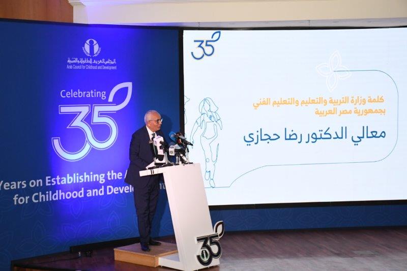 في حين أشار معالي الدكتور رضا حجازي وزير التربية والتعليم والتعليم الفني بجمهورية مصر العربية إلى أن العلاقات البناءة ما بين الوازة والمجلس العربي للطفولة والتنمية لخدمة الأهداف المشتركة في مجال الطفولة، ليس في مصر وحدها، بل في العالم العربي كله. مؤكدا أن الدور الرائد الذي يقوم به المجلس العربي للطفولة والتنمية ما هو إلا استمرار لمسيرة قائد ومؤسس هذا المجلس، صاحب السمو الملكي الأمير طلال بن عبد العزيز آل سعود والتي كانت حافلة بالعديد من المبادرات بغرض دعم جهود التنمية البشرية المستدامة في دول العالم النامية،