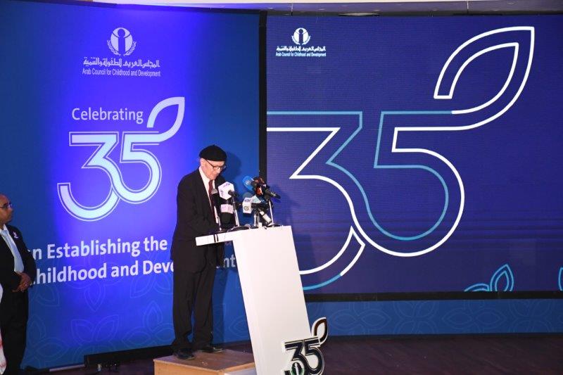 وخلال الاحتفالية قدم سعادة الدكتور حسن البيلاوي أمين عام المجلس العربي للطفولة والتنمية كلمة مشيرا خلالها إلى أن تأسيس المجلس يحكي فكر ونضال صاحب السمو الملكي الأمير طلال بن عبد العزيز كما ويعكس استراتيجية تحويل الأفكار إلي أعمال تنفذ علي أرض الواقع . مضيفا سعادته بأن مصطلح تنمية الطفولة بالنسبة للأمير المؤسس رحمه الله هو المدخل الصحيح إلى تحقيق تنمية شاملة في كل أوطاننا العربية .. من أجل عزة وكرامة الإنسان العربي .. بل والإنسان في كل مكان أينما كان، راصدا في ذلك كيف ان تنمية الطفولة هي عملية واسعة الأبعاد في القلب من التنمية الشاملة ومحورهاـ