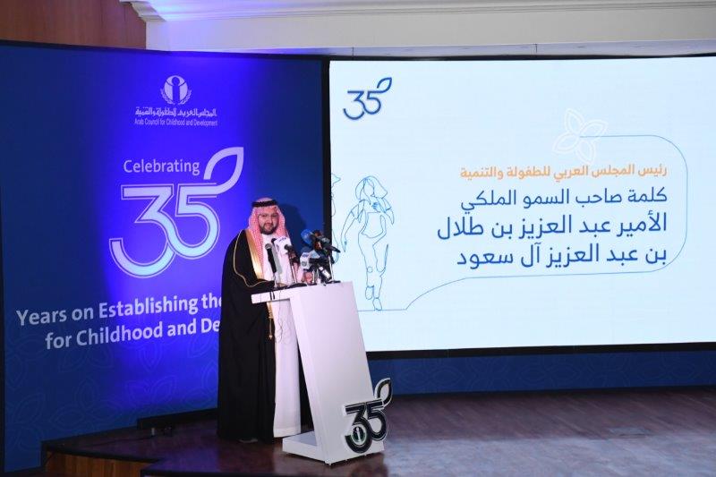 أعرب صاحب السمو الملكي الأمير عبد العزيز بن طلال بن عبد العزيز آل سعود رئيس المجلس العربي للطفولة والتنمية في كلمته، عن فخره واعتزازه بالاجتماع في مصر بمناسبة الاحتفال بمرور 35 عامًا على تأسيس المجلس، مضيفا سموه بأن هذا الصرح قد دشن بتوصية من جامعة الدول العربية، وقدمت له مصر كل التسهيلات لإطلاق مسيرته التنموية لصالح الطفل العربي، فتحية إلى جمهورية مصر العربية رئيساً وحكومة وشعباً.