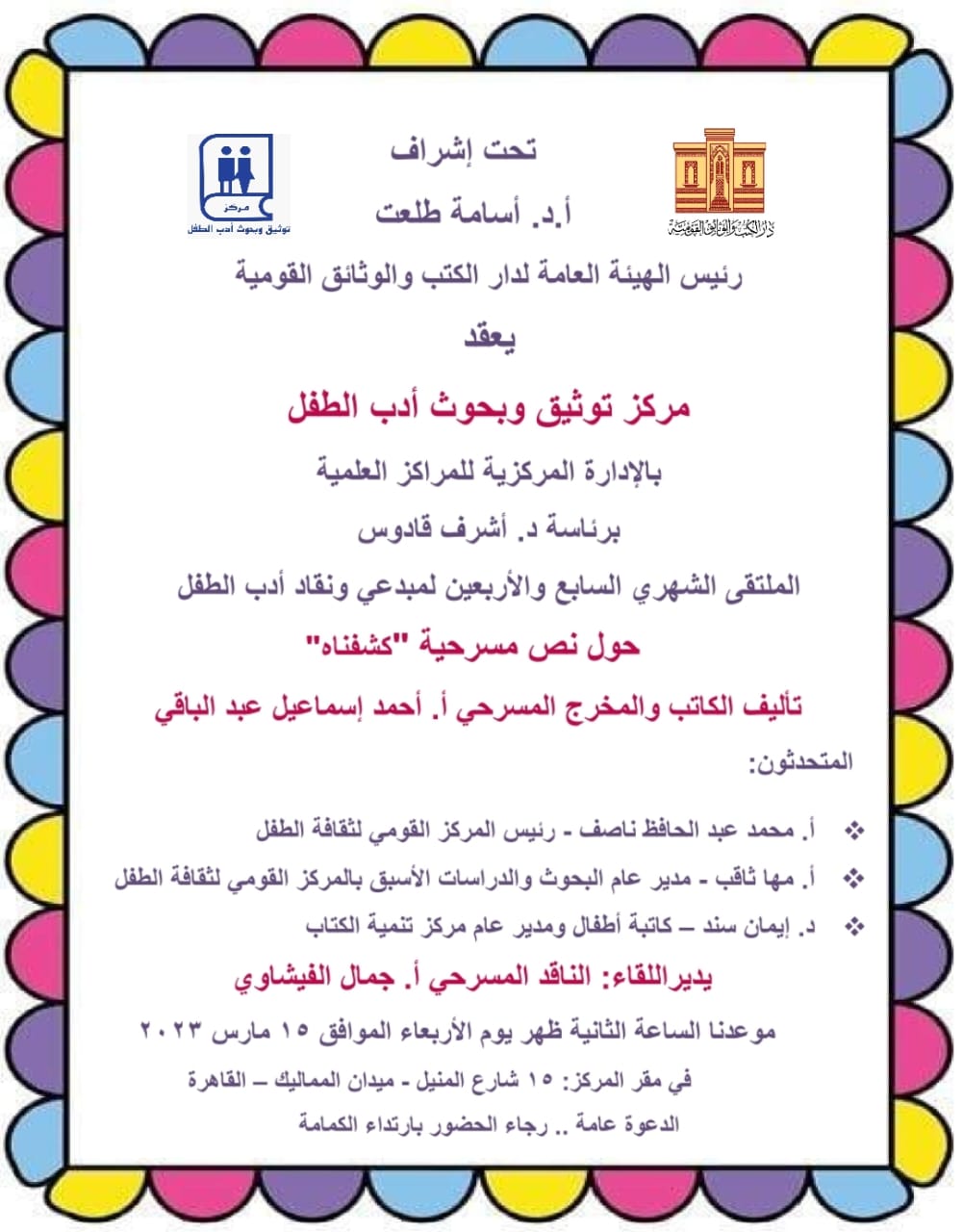 يتحدث في الملتقى: الكاتب محمد عبد الحافظ ناصف – رئيس المركز القومي لثقافة الطفل، أ. مها ثاقب – مدير عام البحوث والدراسات الأسبق بالمركز القومي لثقافة الطفل، دكتورة إيمان سند – كاتبة أطفال ومدير عام مركز تنمية الكتاب، ويديره: جمال الفيشاوي – الناقد المسرحي.وينعقد الملتقى الأربعاء ١٥ مارس ٢٠٢٣ في تمام الساعة الثانية ظهرًا بمقر المركز: ١٥ شارع المنيل – ميدان المماليك – القاهرة.