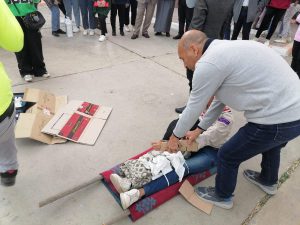 حيث تم الشرح للطلبة والطالبات كيفية التعامل مع الكوارث والازمات بدءا من الخروج بأمان من مكان وقوع الحادث ثم كيفيه عمل طريق امن لوصول سيارات الاسعاف والشرطه والدعم اللوجستى ثم عمل خيام لاستقبال المرضى وايضا شرح جميع طرق الاسعافات الاوليه لاسعاف وانقاذ المرضى ومنها حالات النزيف ، اشتباه الكسور، فقدان الوعى، توقف القلب وعمل انعاش قلب رئوى ، التعامل مع حالات بتر الاعضاء وكيفيه نقل المريض من موقع الحادث الى الخيمه بدون إحداث اى مضاعفات او إصابات اخرى.