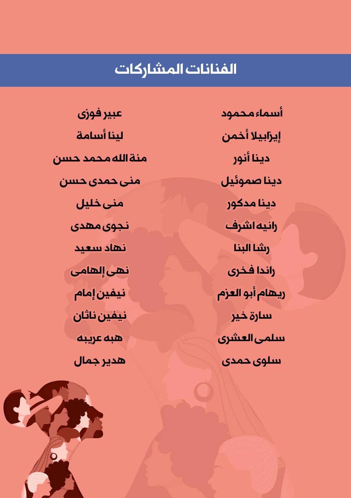 يشارك بالمعرض مجموعة من الفنانات التشكيليات وهن، أسماء محمود، البولندية إيزابيلا أخمن، لينا أسامة، دينا أنور، دينا صموئيل، دينا مدكور، رانيه اشرف، رشا البنا، راندا فخرى، ريهام أبو العزم، سارة خير، سلمى العشري، سلوى حمدي، عبير فوزي، لينا أسامة، منة الله محمد حسن، منى خليل، نجوى مدي، نهاد سعيد، نهى إلهامي، نيفين إمام، نيفين ناثان، هبه عربيه، هدير جمال.