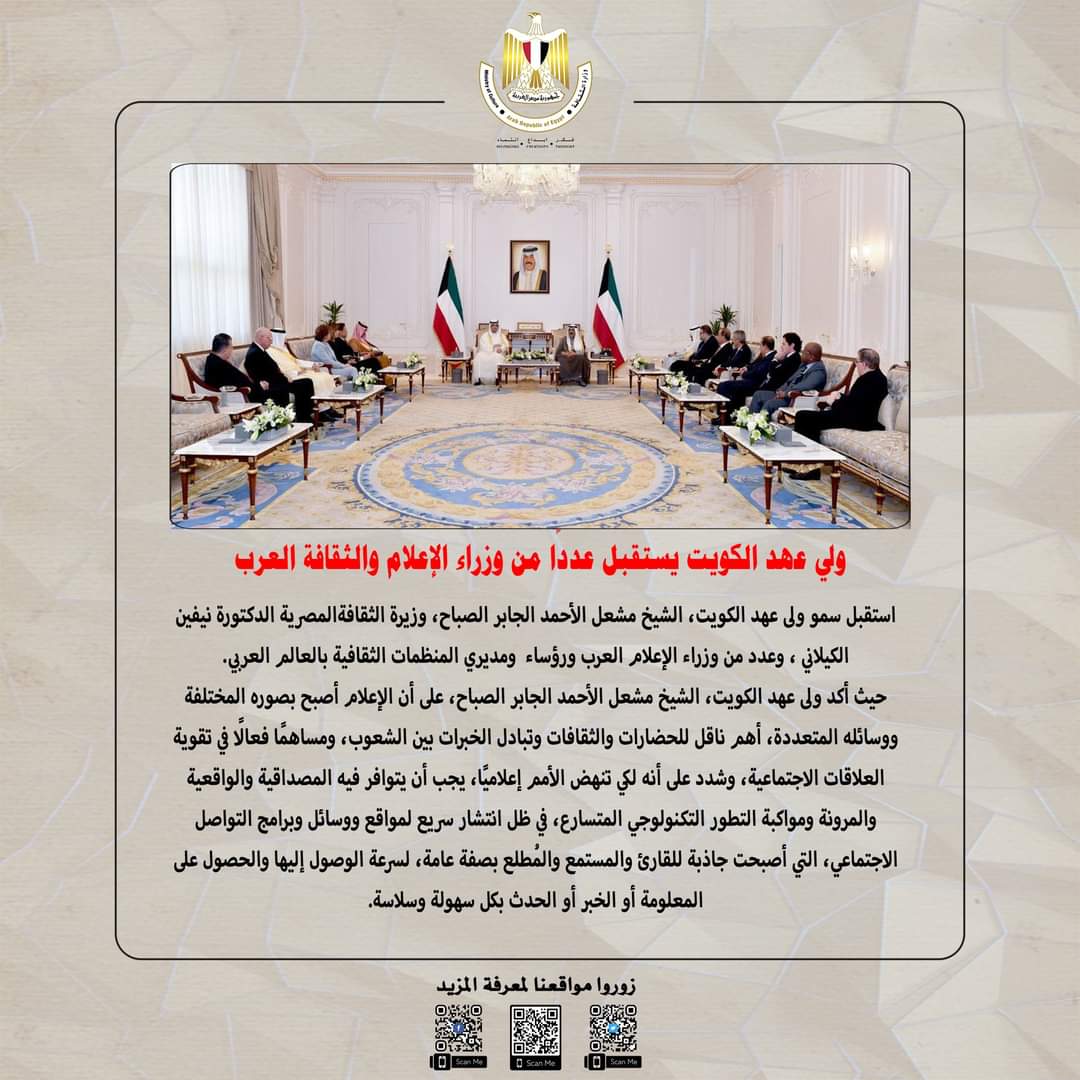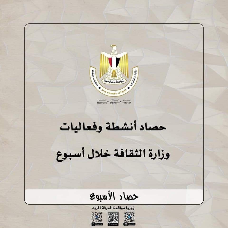 حصاد أنشطة وزارة الثقافة خلال أسبوعأصدرت وزارة الثقافة ،تقريراً تسلط فيه الضوء على حصاد وزيرة الثقافة فى اسبوع منإنجازات ونشاط الدكتورة نيفين الكيلانى وزيرة الثقافة فى اسبوع من لقاءات وفعاليات وأنشطة ثقافية متنوعة