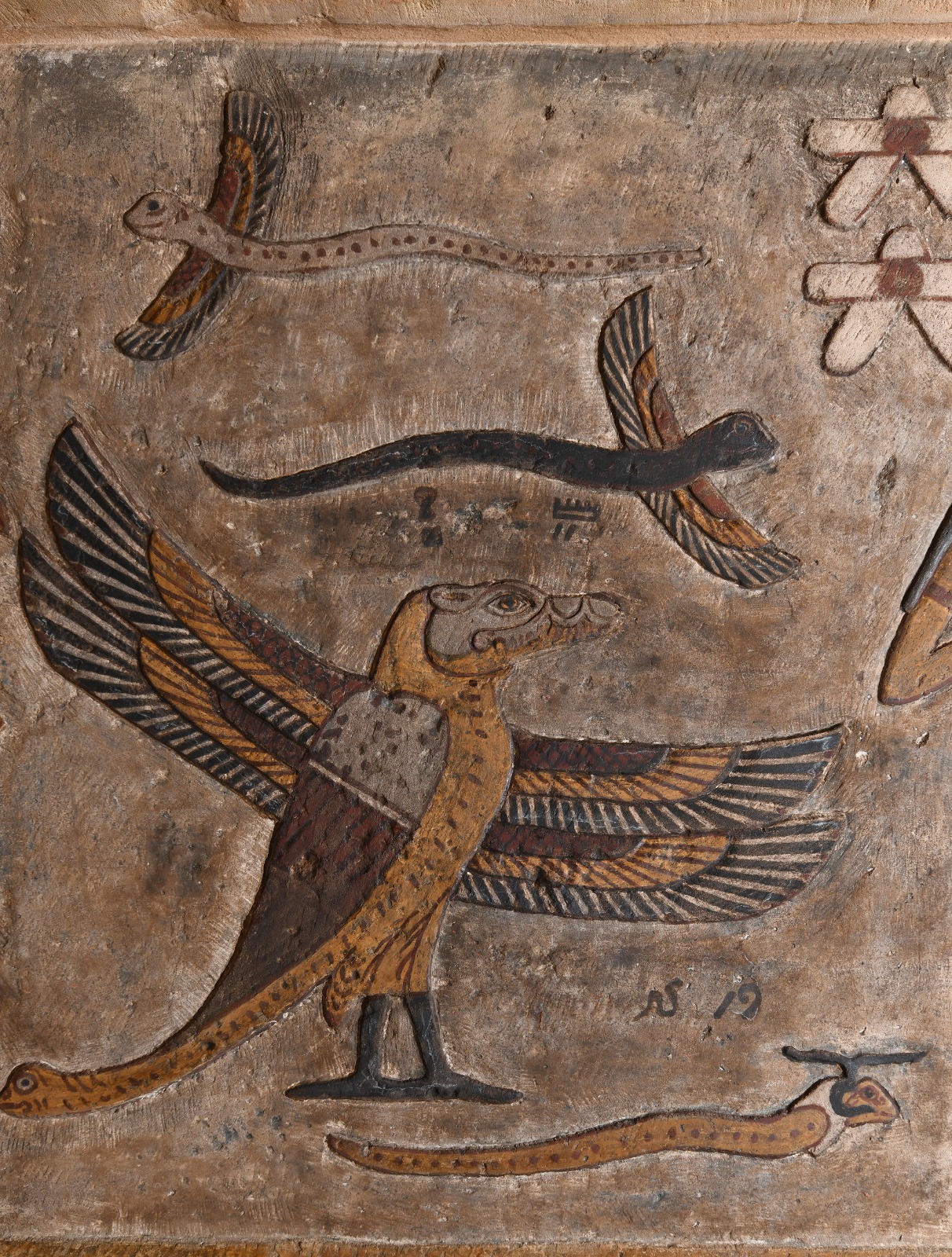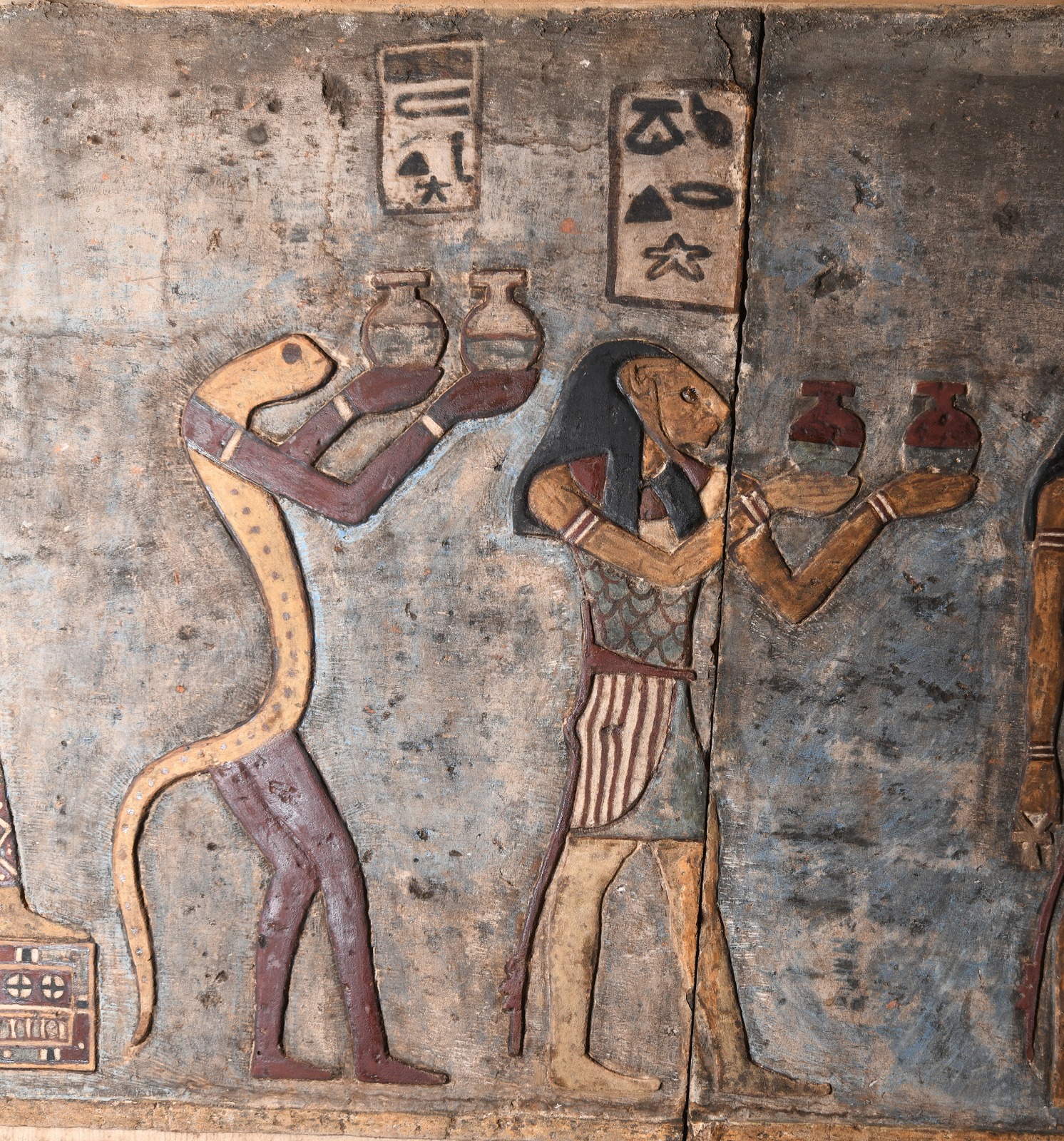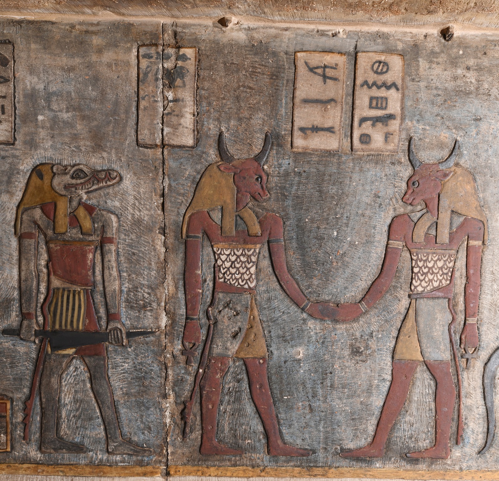 وأضاف د. كريستيان ليتز رئيس البعثة من الجانب الألماني أنه تم كذلك الكشف عن عدد من المناظر التي تصور عدداً من للآلهة المصرية والحيوانات من بينها الثعابين والتماسيح وكذلك مناظر لكائنات مركبة مثل الثعبان برأس كبش أو طائر برأس تمساح وذيل ثعبان وأربعة أجنحة، بالإضافة إلى نقوش إضافية بالحبر الأسود مع أسماء الكائنات الإلهية.
