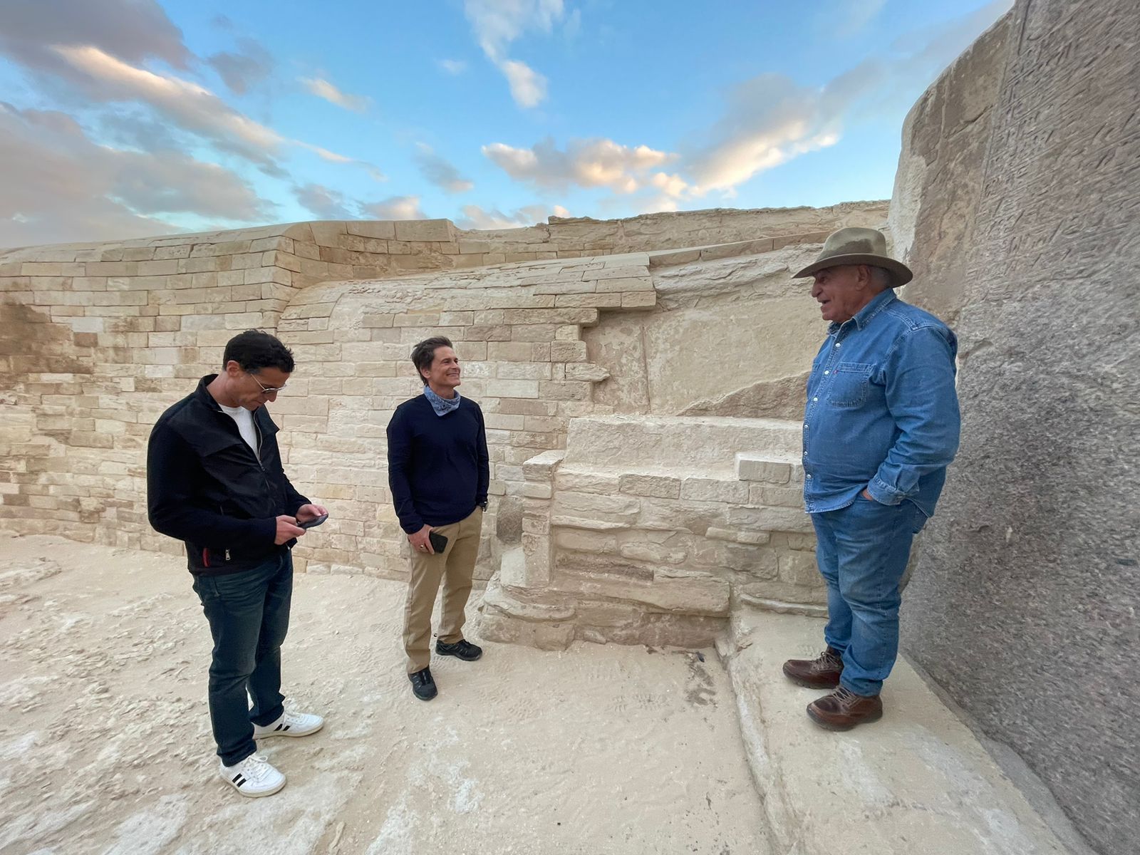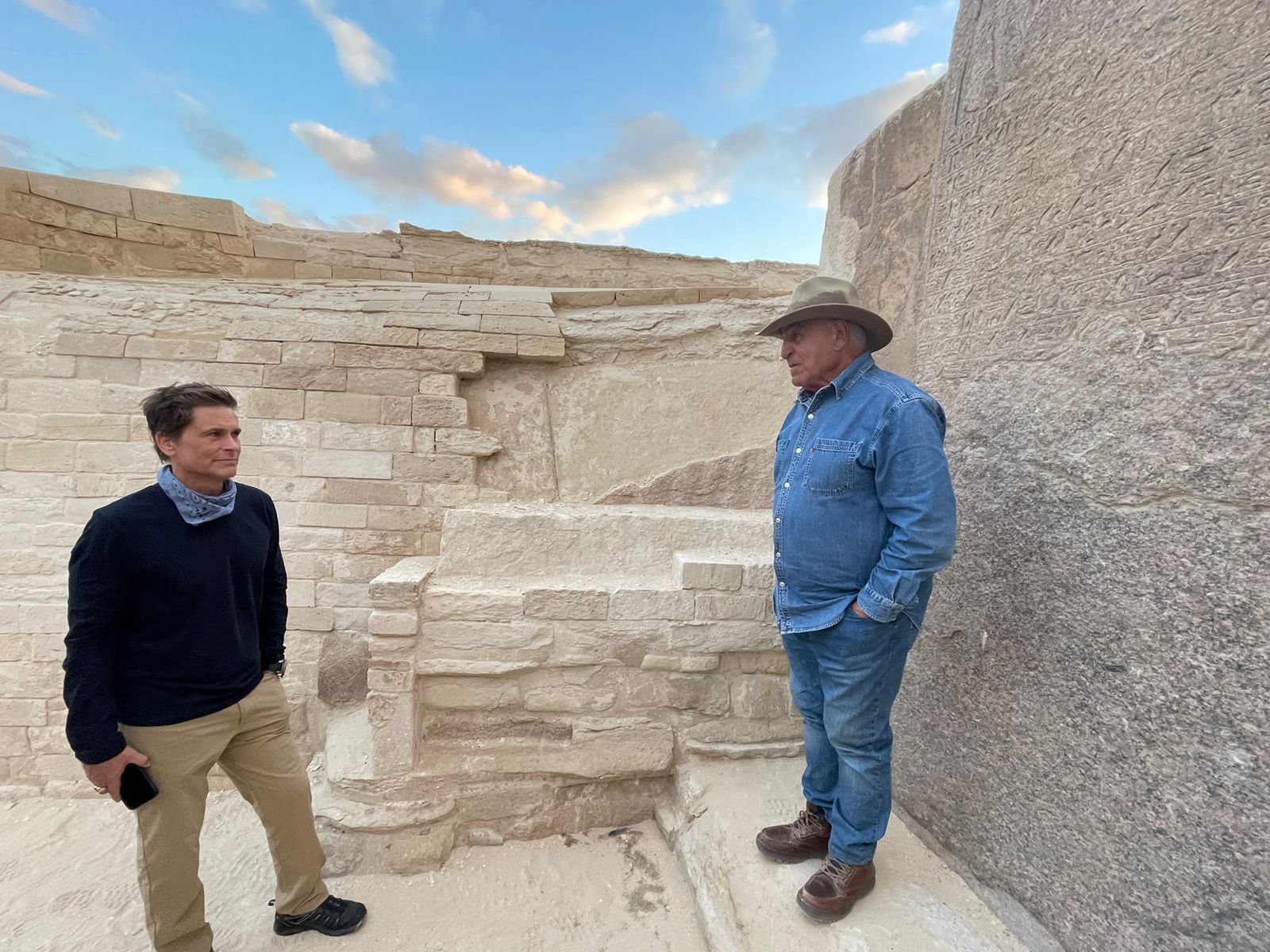 التقى عالم الآثار المصرية الدكتور زاهي حواس الفنان العالمي “روب لو” وذلك أمام تمثال أبو الهول، بالجيزة، وقال حواس ل”روب لو” والوفد المرافق له إن أبو الهول صخرة صماء، والتمثال يرجع للملك خفرع مؤسس الهرم الثاني، وشرح له كيفية بناء الأهرامات، وإكتشاف مقابر العمال بناة الهرم، موضحا أن تلك الإدعاءات التي تقول إن هناك مدينة مفقودة تحت أبو الهول لا تمت للواقع بأية صلة، وليس لها أي دليل علمي على الإطلاق. وتحدث “حواس” عن تفاصيل نتائج أعمال مشروع استكشاف الأهرامات “ScanPyramids”، حيث تم الكشف عن ممر جاملوني بالوجه الشمالي لهرم الملك خوفو الأكبر، يبلغ طوله 9 أمتار، وعرضه حوالي 2.10 متراً.