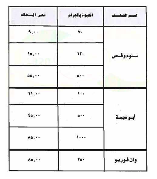 زيادة معسل صنف أبو نجمة عبوة (100) إلى 11 جنيهًا، وعبوة (500) جرام إلى 45 جنيهًا، وعبوة (1000) جرام إلى 85 جنيهًا.