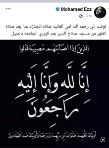 وأضاف :” صلاة الجنازة غدا بعد صلاة الظهر من مسجد صلاح الدين بعد كوبري الجامعة بالمنيل”.
