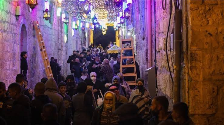 تشهد فلسطين ممارسة العادات والتقاليد فى شهر رمضان المعظم بدءا من العادات والتقاليد فى تركيب الزينة وإضاءة الفوانيس وحلوى رمضان وتمثل هذه العادات ثقافة وحضارة في المجتمع الفلسطيني ، يبدأ شهر رمضان في فلسطين من مدينة القدس حيث المسجد الأقصى فالفلسطينيين ينجحون دائما في الصلاة في المدينة العتيقة متخطين كل الحواجز ، وليلة إعلان قدوم الشهر الفضيل يجتمع أطفال فلسطين في الحارات مترقبين إعلان بدء الصيام وما أن يعلن عن ثبوت رؤية الهلال تبدأ المساجد بالتكبير و رفع الأدعية والابتهالات وترى الفوانيس في كل مكان وقد خرج بها الأطفال في واحدة من التقاليد التي لا تزال تدخل بهجتها على القلوب إلى اليوم وينتشر الصغار في الشوارع ينشدون ويرحبون بالزائر الطيب فيما تزين الطرقات بالزينة والإضاءة الملفتة للنظر المفرحة للقلوب… وفي رمضان النهار للعمل والليل للعبادة من صلاة وقراءة قرآن وجلسات ذكر وتسبيح ويتسابق المتسابقون في تلاوة القرآن ويذهب الناس للنوم ليستيقظوا قبل أذان الفجر على صوت المسحراتي ليتناولوا السحور حيث يؤدي أغلب الناس صلواتهم في المساجد ويستقبلون ساعات الفجر الأولى من كل يوم فيها. الإفطار الجماعي لا يغيب عن الشارع الفلسطيني فشهر رمضان كله خير وبركة وفيه تزداد روابط العلاقات الاجتماعية والأسرية بين الأسرة وبين العشيرة إذ يلمس الناس تفرد الشهر الكريم بخصوصية عن باقي الشهور العام سواء في السلوك أو في العلاقات أو الإفطار والسحور . كما أن لشهر رمضان في فلسطين مذاقا خاصا ليس له مثيل فرغم الضنك والمعاناة والجراح والآلام يزيد الناس في تواصلهم وتوادهم كما تنتشر الولائم والإفطارات الجماعية في المساجد ومن أهم سمات رمضان في فلسطين … تبادل الإفطار الأسري وهو برنامج لا يغيب عن أجندة العائلات في هذا الشهر حيث تتفنن ربات البيوت في إعداد الأكلات والتباهي بأشهاها أكلات صنعت في فلسطين يتميز الشعب الفلسطيني عن غيره من الشعوب بتنوع أصناف الطعام والشراب في شهر رمضان وتتسم كل منطقة بنوع معين من الأكلات خاصة المقلوبة والمسخن والمفتول والقدرة الخليلة التي تغزو موائد غزة والخليل… بينما يتربع على عرش موائد الإفطار في الضفة الغريبة المسخن والمنسف ولا تخلو موائد الإفطار الفلسطينية من المتبلات والمخللات بأنواعها والسلطات المختلفة لفتح الشهية والزيتون والزيت والزعتر. أما المشروبات التي اعتاد عليها الفلسطينيون في هذا الشهر فأهمها شراب الخروب الذي لا تخلو موائد البيوت منه كما لا يتوانى الباعة عن تقديمه في الأسواق والساحات العامة مع مشروبات أخرى مثل الكركدية وقمر الدين وعرق السوس. حيث اول يوم من الشهر الفضيل وبعد صلاة العصر تزدحم الأسواق بالصائمين لشراء حاجاتهم وتنشط الشوارع بالحركة وتظل هذه الحال حتى قبيل موعد الإفطار ببضع دقائق وتمتلئ أسواق فلسطين بمظاهر شهر الصيام خصوصاً لدى باعة الحلويات وخاصة عند باعة القطايف التي لا تكاد تخلو منها أية مائدة قطايف الجوز والجبنة والقشدة والعصافيري والفستق الحلبي. وأجمل من عادات الشعب الفلسطيني في رمضان قيام كبير العائلة بدعوة أبنائه وعائلاتهم على مائدة الإفطار في أول يوم رمضاني كما يقوم بزيارة أرحامه وتقديم الهدايا لهم بمناسبة حلول الشهر الفضيل وغالبا ما يتم هذا الأمر بعد الإفطار واعتاد الفلسطينيون أن يشجعوا أطفالهم في سن مبكرة على صوم رمضان بعادة يسمونها درجات الميدنة أي مأذنة المسجد وهي ما يعادل نصف نهار أو أقل بقليل ثم يتدرج فيه الطفل قليلا قليلا حسب استطاعته. ادام الله شعب فلسطين وساعدهم في محنتهم ورزقنا امه المسلمين جميعا الصلاه في المسحد الاقصي.