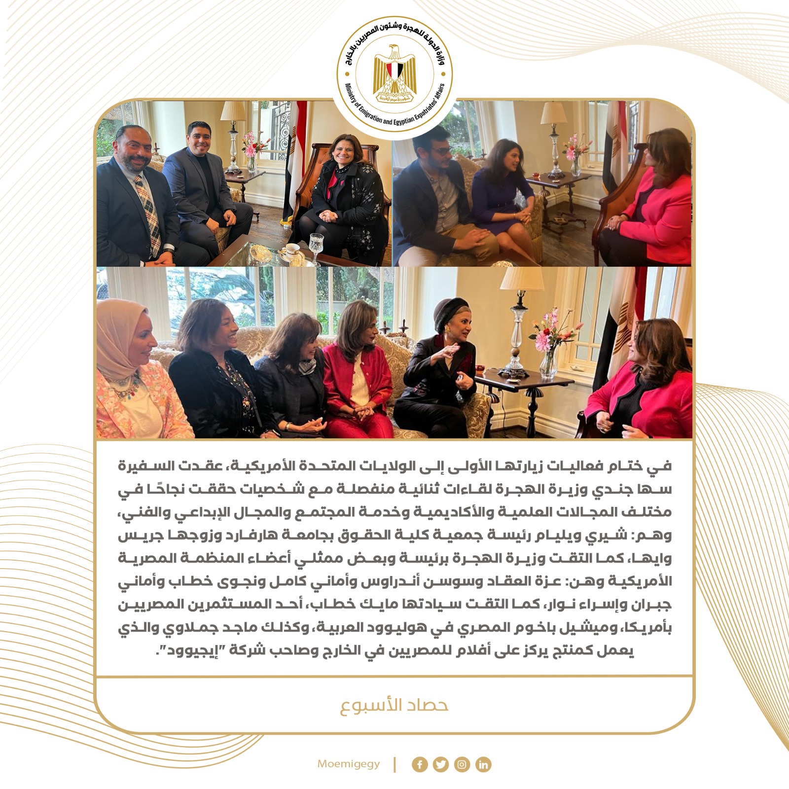 1) في ختام فعاليات زيارتها الأولى إلى الولايات المتحدة الأمريكية، عقدت السفيرة سها جندي وزيرة الهجرة لقاءات ثنائية منفصلة مع شخصيات حققت نجاحًا في مختلف المجالات العلمية والأكاديمية وخدمة المجتمع والمجال الإبداعي والفني، وهم: شيري ويليام رئيسة جمعية كلية الحقوق بجامعة هارفارد وزوجها جريس وايها، كما التقت وزيرة الهجرة برئيسة وبعض ممثلي أعضاء المنظمة المصرية الأمريكية وهن: عزة العقاد وسوسن أندراوس وأماني كامل ونجوى خطاب وأماني جبران وإسراء نوار، كما التقت سيادتها مايك خطاب، أحد المستثمرين المصريين بأمريكا، وميشيل باخوم المصري في هوليوود العربية، وكذلك ماجد جملاوي والذي يعمل كمنتج يركز على أفلام للمصريين في الخارج وصاحب شركة “إيجيوود”.