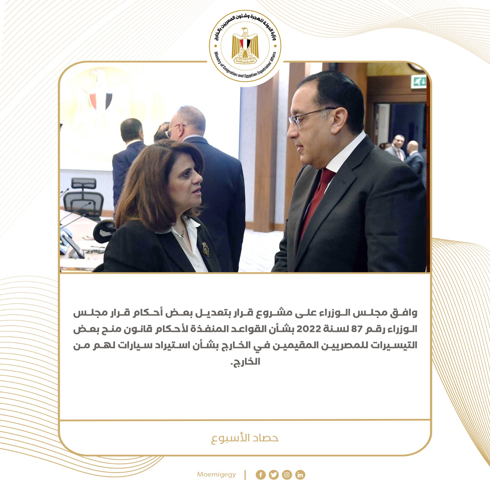 8) وافق مجلس الوزراء على مشروع قرار بتعديل بعض أحكام قرار مجلس الوزراء رقم 87 لسنة 2022 بشأن القواعد المنفذة لأحكام قانون منح بعض التيسيرات للمصريين المقيمين في الخارج بشأن استيراد سيارات لهم من الخارج.