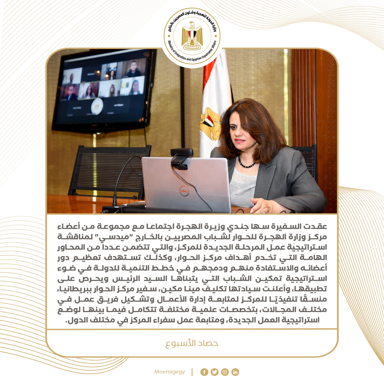 5) عقدت السفيرة سها جندي وزيرة الهجرة اجتماعا مع مجموعة من أعضاء مركز وزارة الهجرة للحوار لشباب المصريين بالخارج “ميدسي” لمناقشة استراتيجية عمل المرحلة الجديدة للمركز، والتي تتضمن عددا من المحاور الهامة التي تخدم أهداف مركز الحوار، وكذلك تستهدف تعظيم دور أعضائه والاستفادة منهم ودمجهم في خطط التنمية للدولة في ضوء استراتيجية تمكين الشباب التي يتبناها الرئيس ويحرص على تطبيقها، وأعلنت سيادتها تكليف مينا مكين، سفير مركز الحوار ببريطانيا، منسقًا تنفيذيًا للمركز لمتابعة إدارة الأعمال وتشكيل فريق عمل في مختلف المجالات، بتخصصات علمية مختلفة تتكامل فيما بينها لوضع استراتيجية العمل الجديدة، ومتابعة عمل سفراء المركز في مختلف الدول. كما أدارت الوزيرة نقاشًا حول محاور استراتيجية المرحلة الجديدة لـ”ميدسي”، والتي تتميز بعدد من الملفات الهامة أبرزها هو البدء في تشكيل مجلس استشاري لشباب الباحثين المصريين بالخارج يضم كافة التخصصات العلمية، وتصبح مهمته الرئيسية هو تقديم أفكار وتوصيات وحلول علمية لكافة المجالات ذات الأولوية بالنسبة للدولة بالتعاون مع الوزارات والجهات المعنية بشكل تطوعي، يأتي ذلك بعد إشادة عدد من الوزراء بمشاركة وزارة الهجرة في مؤتمر قمة المناخ cop 27، وما قدموه شباب الباحثين المصريين بالخارج من أطروحات وأفكار خاصة بالاستدامة والبيئة.