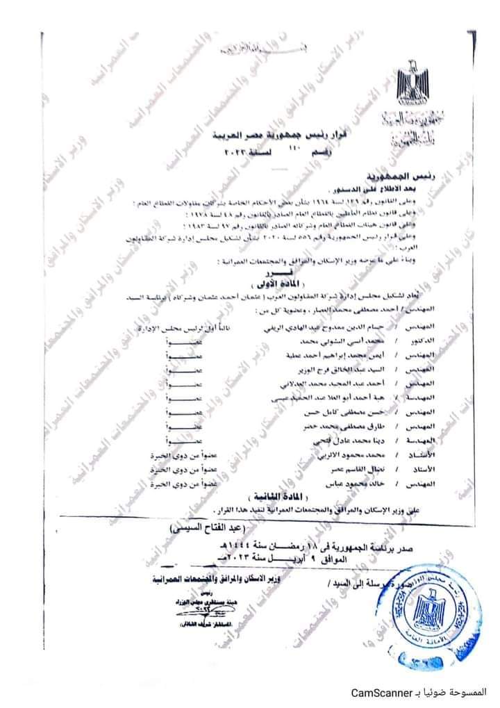 أصدر الرئيس عبدالفتاح السيسي رئيس الجمهورية قراراً رقم ١٤٠ لسنة 2023 بإعادة تشكيل مجلس إدارة شركة المقاو العرب “عثمان أحمد عثمان وشركاه” وذلك بناءً على ما عرضه الدكتور عاصم الجزار وزير الإسكان والمرافق والمجتمعات العمرانية.