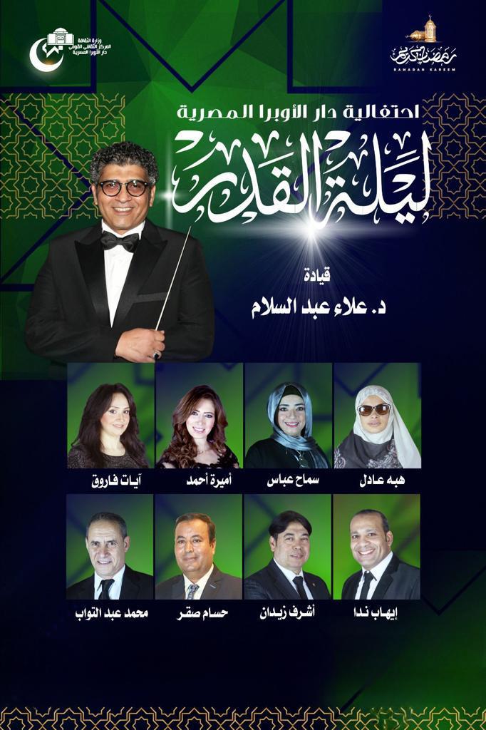 احتفالا بليلة القدر تنظم دار الأوبرا المصرية برئاسة الدكتور خالد داغر حفلا لفرقة الإنشد الديني بقيادة المايسترو الدكتور علاء عبد السلام وذلك فى التاسعة والنصف مساء الاحد 16 إبريل على مسرح سيد درويش ” أوبرا الاسكندرية ” .