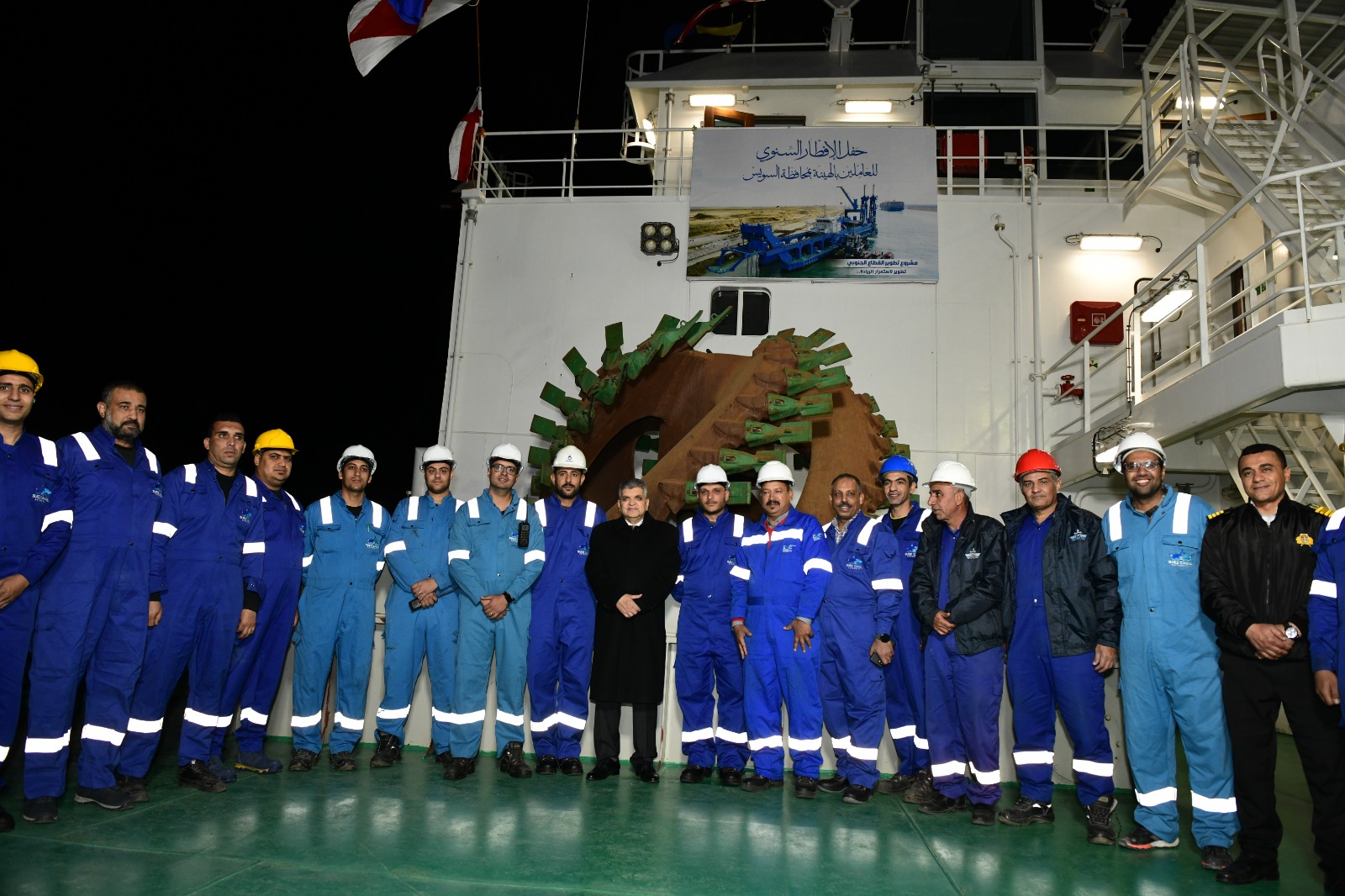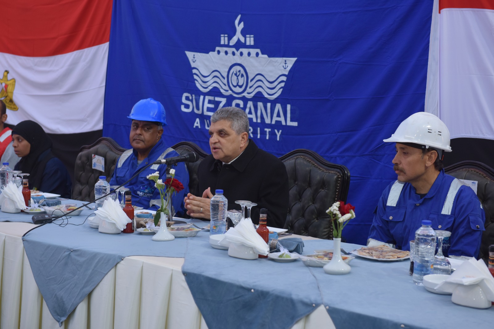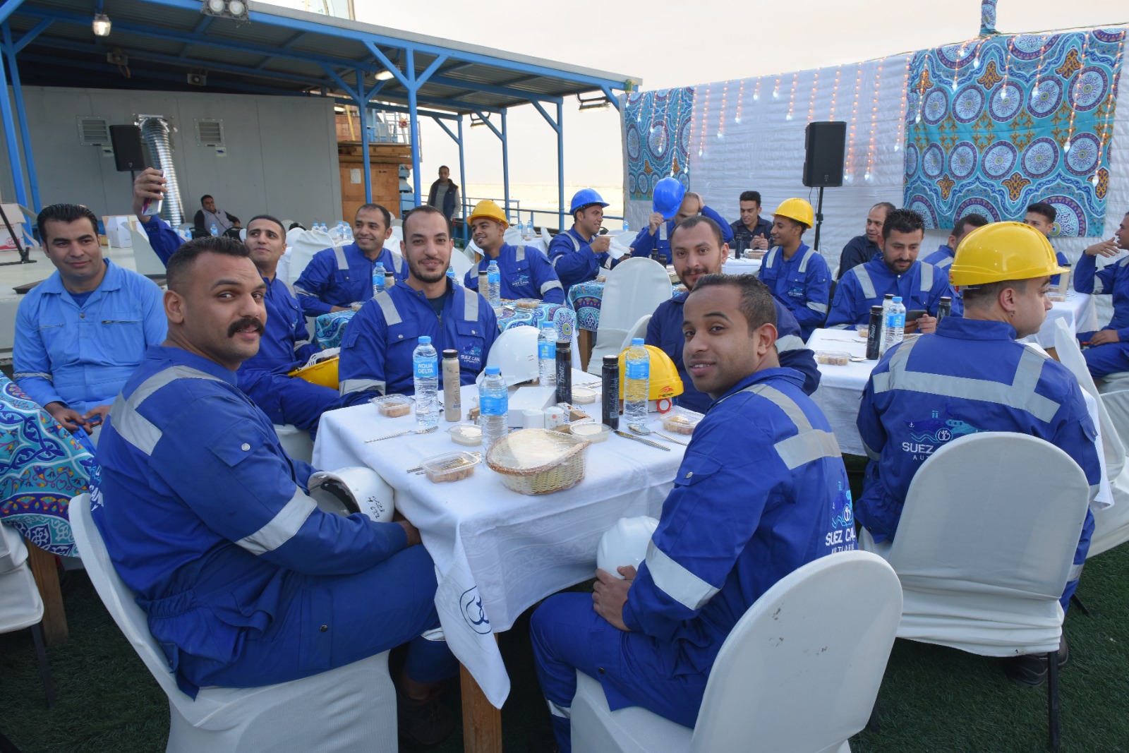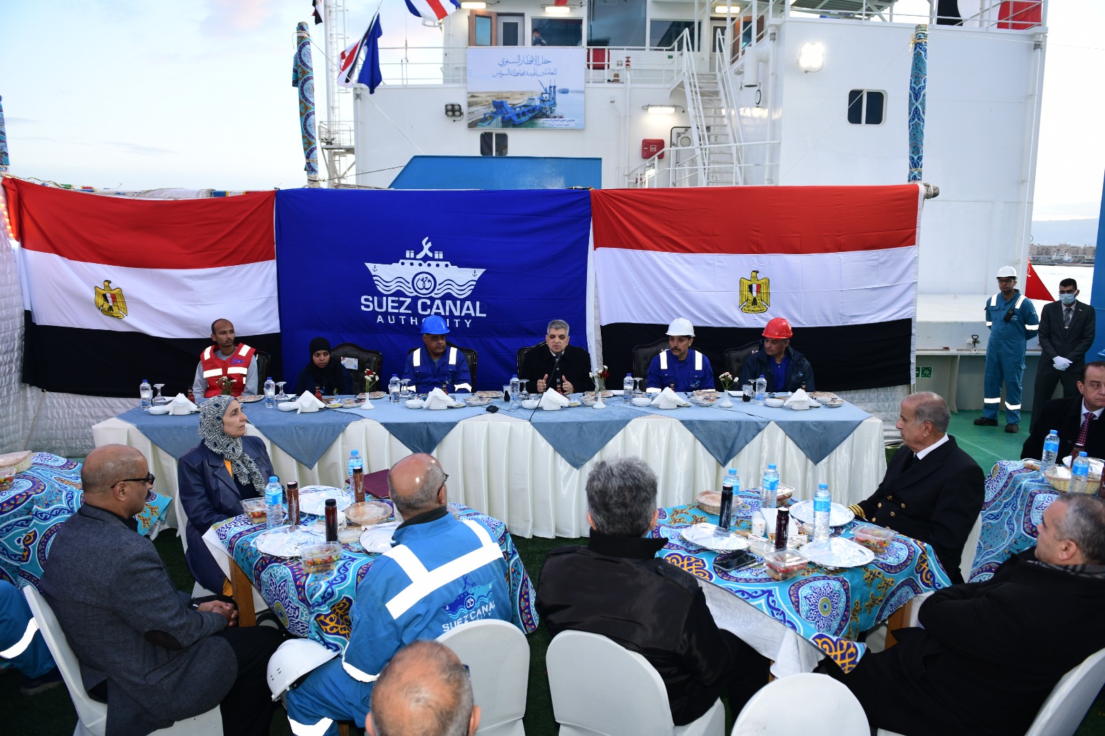 عقب ذلك، شارك الفريق أسامة ربيع العاملين بالمشروع والعاملين من مختلف إدارات الهيئة بمحافظة السويس الإفطار على متن الكراكة مهاب مميش أكبر كراكات الشرق الأوسط وإفريقيا والتى احتفلت الهيئة أمس 12 إبريل بمرور عامين على استلام الكراكة بعد استكمال بنائها بترسانة IHC الهولندية.