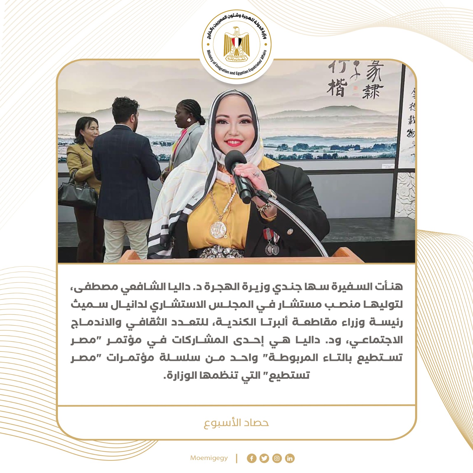 كما هنأت السفيرة سها جندي وزيرة الهجرة داليا الشافعي مصطفى، لتوليها منصب مستشار في المجلس الاستشاري لدانيال سميث رئيسة وزراء مقاطعة ألبرتا الكندية، للتعدد الثقافي والاندماج الاجتماعي، ود. داليا هي إحدى المشاركات في مؤتمر مصر تستطيع بالتاء المربوطة واحد من سلسلة مؤتمرات مصر تستطيع التي تنظمها الوزارة.
