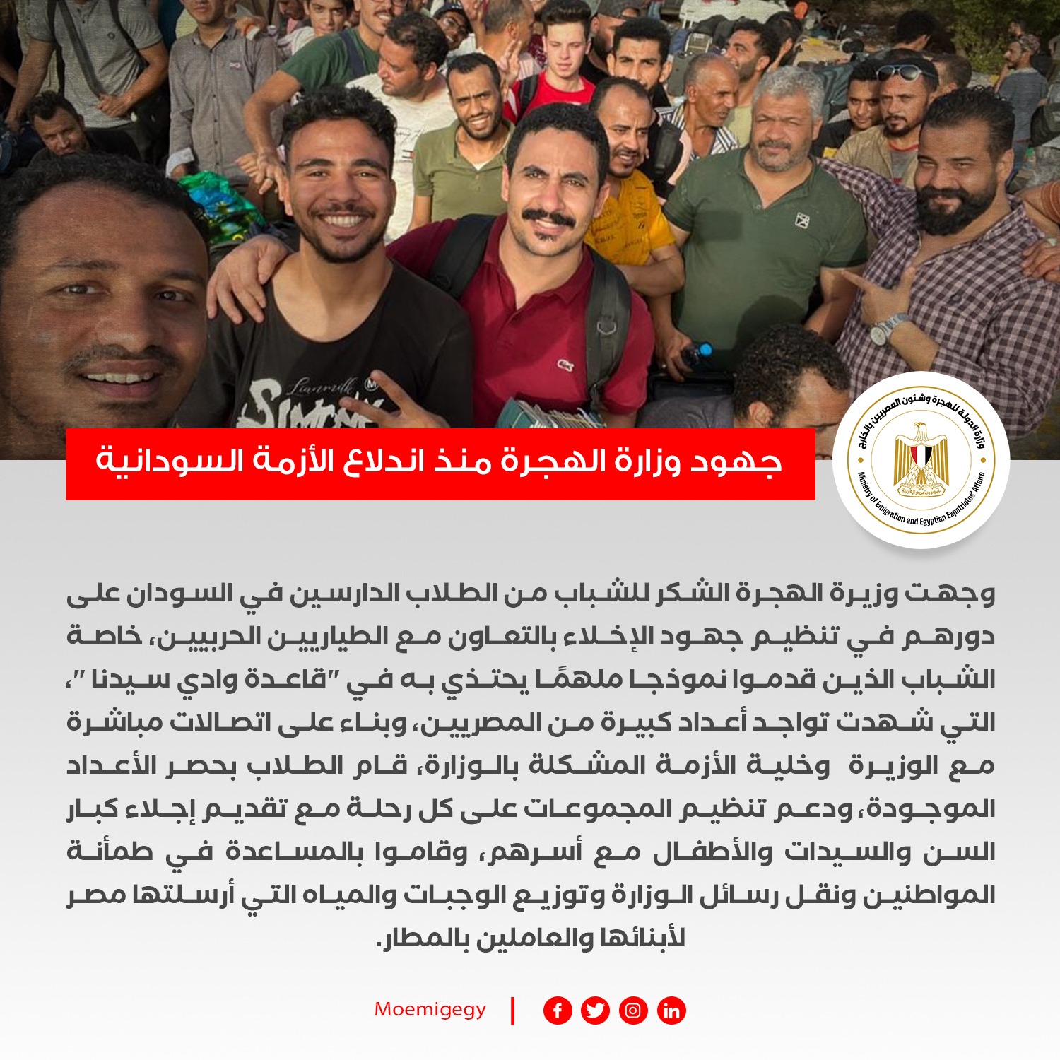 – وجهت وزيرة الهجرة الشكر للشباب من الطلاب الدارسين في السودان على دورهم في تنظيم جهود الإخلاء بالتعاون مع الطيارين الحربيين، خاصة الشباب الذين قدموا نموذجًا ملهمًا يحتذي به في “قاعدة وادي سيدنا “، التي شهدت تواجد أعداد كبيرة من المصريين، وبناء على اتصالات مباشرة مع الوزيرة وخلية الأزمة المشكلة بالوزارة، قام الطلاب بحصر الأعداد الموجودة، ودعم تنظيم المجموعات على كل رحلة مع تقديم إجلاء كبار السن والسيدات والأطفال مع أسرهم، وقاموا بالمساعدة في طمأنة المواطنين ونقل رسائل الوزارة وتوزيع الوجبات والمياه التي أرسلتها مصر لأبنائها والعاملين بالمطار.
