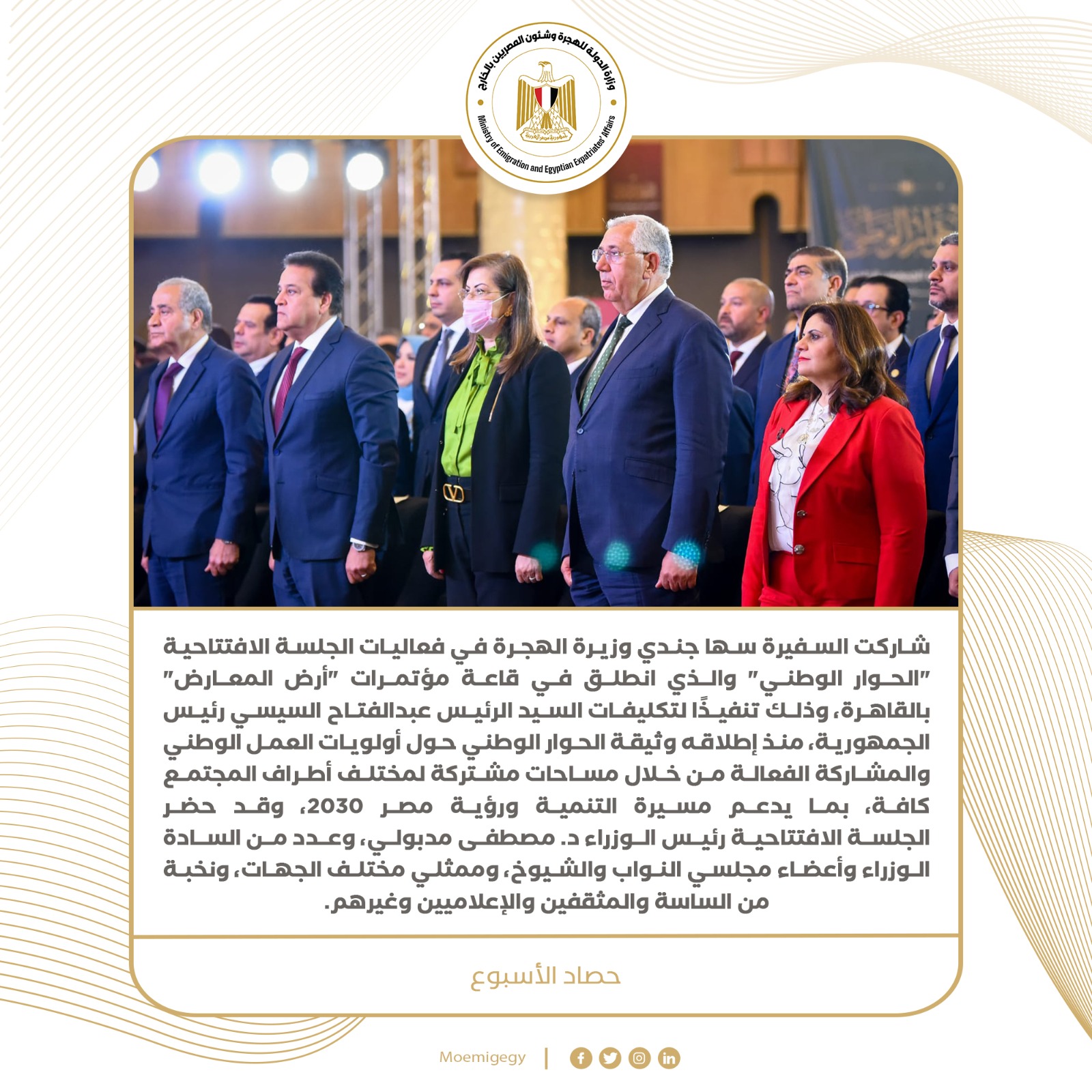شاركت السفيرة سها جندي وزيرة الهجرة في فعاليات الجلسة الافتتاحية “الحوار الوطني” والذي انطلق في قاعة مؤتمرات “أرض المعارض” بالقاهرة، وذلك تنفيذًا لتكليفات الرئيس عبدالفتاح السيسي رئيس الجمهورية، منذ إطلاقه وثيقة الحوار الوطني حول أولويات العمل الوطني والمشاركة الفعالة من خلال مساحات مشتركة لمختلف أطراف المجتمع كافة، بما يدعم مسيرة التنمية ورؤية مصر 2030، وقد حضر الجلسة الافتتاحية رئيس الوزراء د. مصطفى مدبولي، وعدد من السادة الوزراء وأعضاء مجلسي النواب والشيوخ، وممثلي مختلف الجهات، ونخبة من الساسة والمثقفين والإعلاميين وغيرهم.