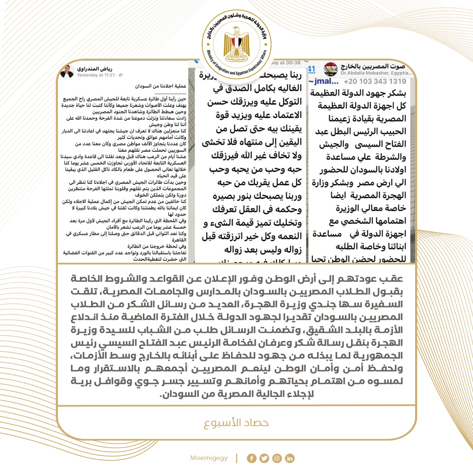 عقب عودتهم إلى أرض الوطن وفور الإعلان عن القواعد والشروط الخاصة بقبول الطلاب المصريين بالسودان بالمدارس والجامعات المصرية، تلقت السفيرة سها جندي وزيرة الهجرة، العديد من رسائل الشكر من الطلاب المصريين بالسودان تقديرا لجهود الدولة خلال الفترة الماضية منذ اندلاع الأزمة بالبلد الشقيق، وتضمنت الرسائل طلب من الشباب للسيدة وزيرة الهجرة بنقل رسالة شكر وعرفان للرئيس عبد الفتاح السيسي رئيس الجمهورية لما يبذله من جهود للحفاظ على أبنائه بالخارج وسط الأزمات، ولحفظ أمن وأمان الوطن لينعم المصريين أجمعهم بالاستقرار وما لمسوه من اهتمام بحياتهم وأمانهم وتسيير جسر جوي وقوافل برية لإجلاء الجالية المصرية من السودان، والحرص على تذليل أي عقبات أمام استكمال دراستهم بالوطن.