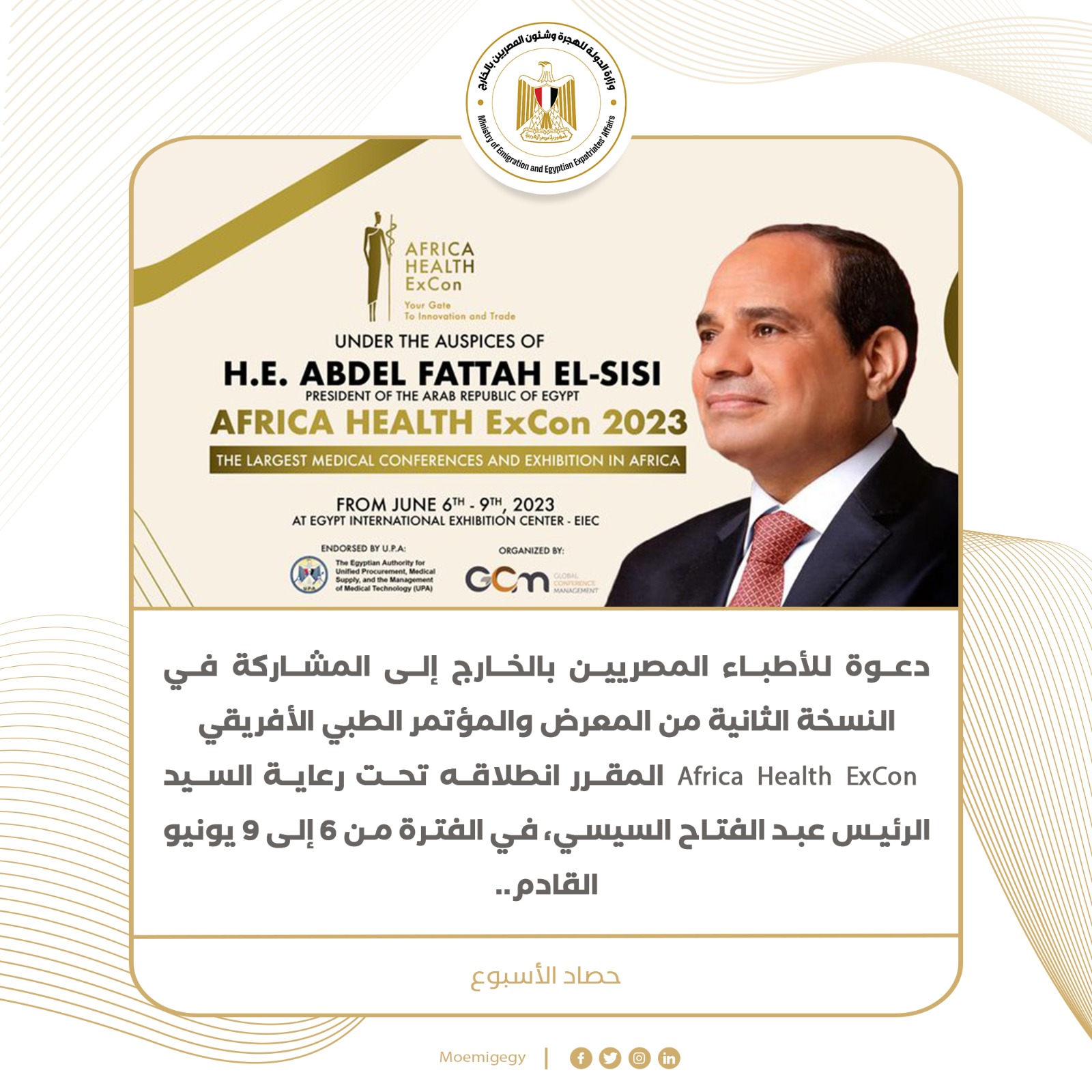 وجهت وزارة الهجرة دعوة إلى كل الأطباء المصريين في الخارج للمشاركة في النسخة الثانية من المؤتمر والمعرض الطبي الأفريقي المقرر انطلاقه في الفترة من 6 إلى 9 يونيو القادم Africa Health ExCon ، تحت رعاية الرئيس عبد الفتاح السيسي رئيس الجمهورية.