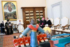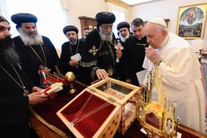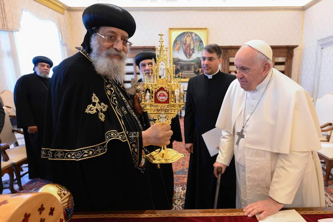 وأهدى قداسة البابا تواضروس الثاني، بابا الڤاتيكان عقب لقاءهما صباح اليوم صندوقًا يحوى أجزاء من ملابس الـ ٢١ شهيد الأقباط الذين استشهدوا بليبيا المحفوظ رفاتهم ومتعلقاتهم في كاتدرائية شهداء الإيمان في قرية العور بإيبارشية سمالوط، مع ثلاثة أربطة من التي رُبِطَت أيديهم بها وقت استشهادهم ذبحًا وهم يصلون داعين اسم الرب يسوع كما في فيلم الفيديو الذي سجل هذه اللحظات.