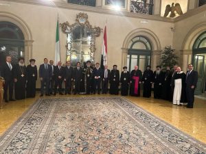 وقال السفير بسام راضي -في كلمته خلال حفل العشاء- “أنا على المستوى الشخصي متابع قداستكم ولي الحظ أن أكون سفيرا لمصر في وقت زيارة قداستكم لإيطاليا، وكان لي الشرف أن أزور قداستكم في لقاءات عديدة خلال زيارة الرئيس عبدالفتاح السيسي رئيس الجمهورية لكاتدرائية ميلاد المسيح بالعاصمة الإدارية الجديدة في كل عيد ميلاد مجيد. ونحن نلمس جميعا في شخصكم المحبة والسلام، والحقيقة أن قداستكم واجهة مشرفة لمصر، والسفارة تشرفت بزيارة قداستكم”.