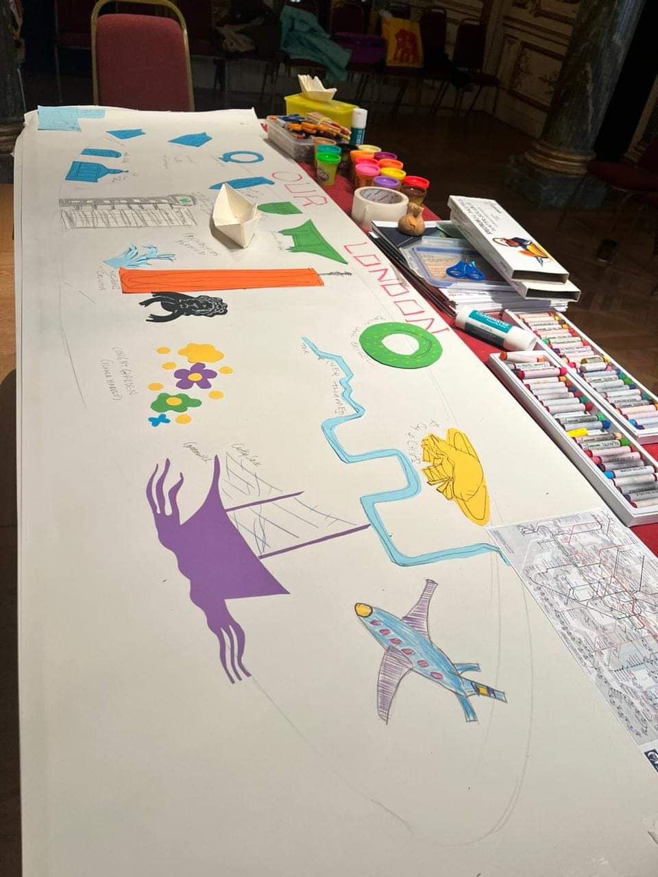وخلال فعاليات الورشة اتفق المشاركون جميعا على إنشاء عمل تعاوني وتطويره كفريق من خلال الحوار، وقاموا بإنشاء خريطة بصرية مجردة للندن باستخدام الرسوم التوضيحية.