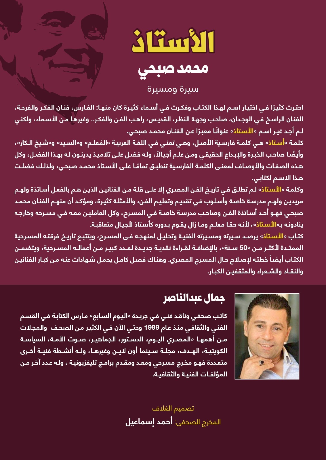 كتاب «الأستاذ» يقدم من خلاله الكاتب الصحفي والناقد الفني جمال عبدالناصر، سيرة ومسيرة الفنان والنجم الكبير محمد صبحي منذ البدايات وحتي اللحظة الآنية، وداخل الكتاب تحليل لمنهجه في المسرح، وتتبع مستفيض لتاريخ فرقته المسرحية، وهي أقدم وأكبر فرقة فهي ممتدة لأكثر من «50 عاما»، بالإضافة لقراءة نقدية جديدة للكثير من أعماله المسرحية، ويتضمن الكتاب فصلا كاملا عن علاقته بالراحل لينين الرملي وكيف كونا تيارا مسرحيا جديدا في المسرح المصري، كما يتضمن الكتاب خطته لإصلاح حال المسرح المصري، وهناك فصل كامل يحمل شهادات عنه من كبار الفنانين والنقاد والشعراء والمثقفين الكبار من مصر والدول العربية الشقيقة كالجزائر والكويت والعراق والأردن، وملحق صور بالألوان به الكثير من الصور النادرة والجديدة التي تنشر لأول مرة .