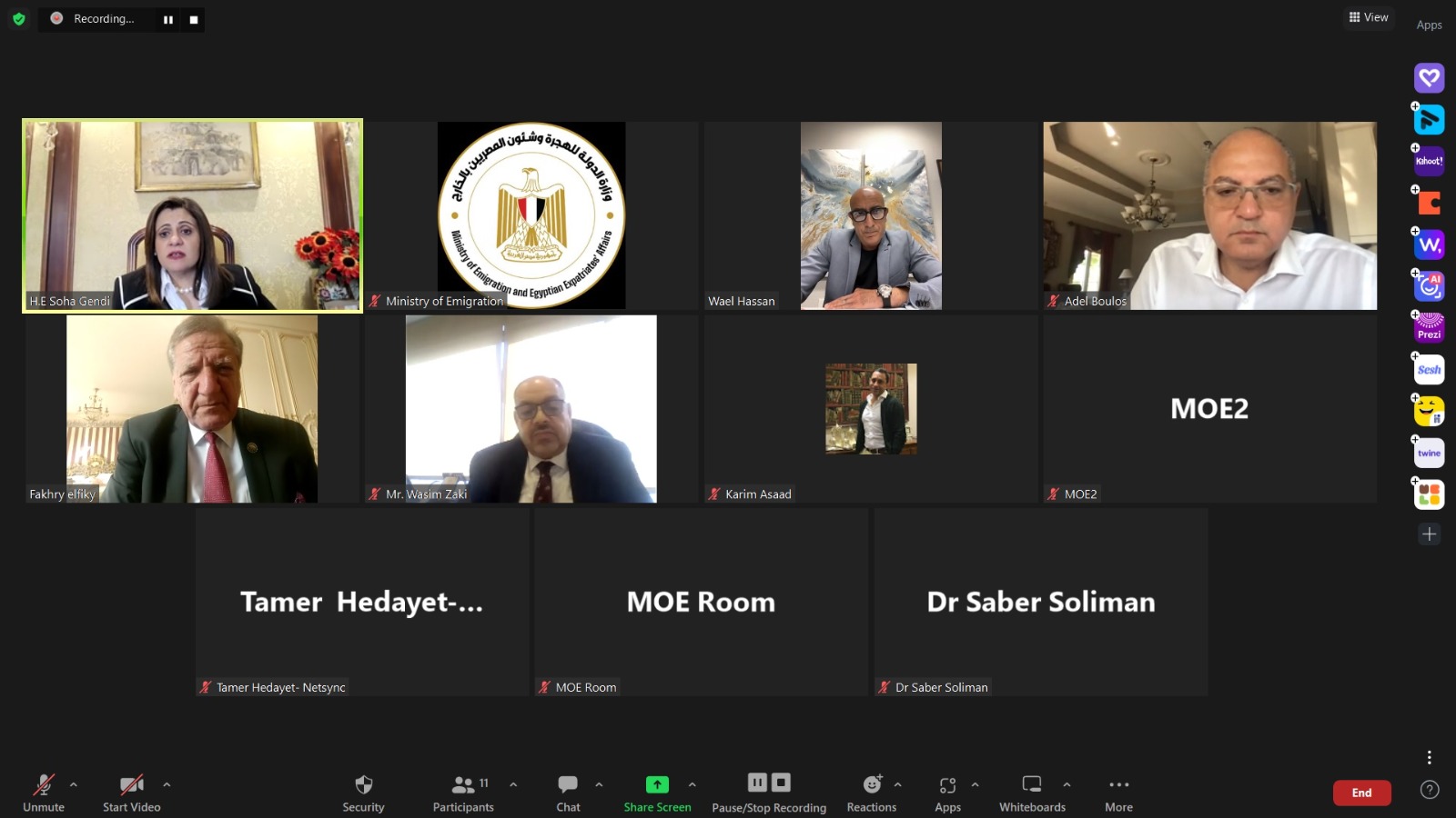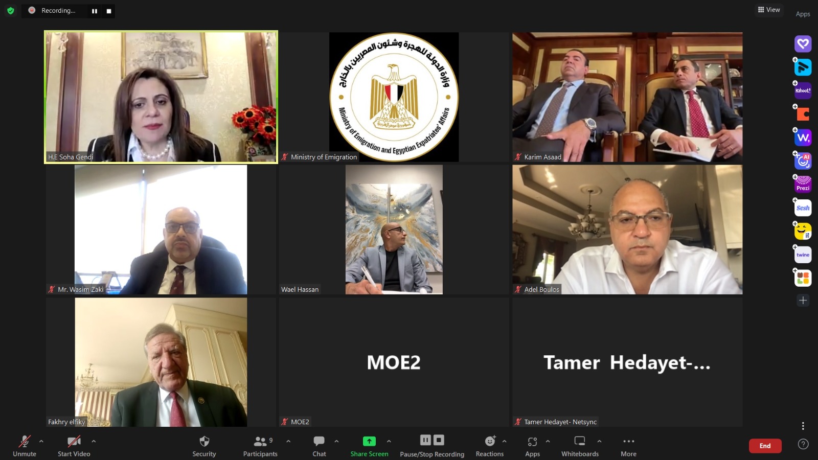 كما شارك عبر “الفيديوكونفرانس” المهندس تامر هدايت، رجل الأعمال بالولايات المتحدة الأمريكية رئيس مجلس إدارة شركة “نت سينك” الأمريكية، والخبير المصرفي وائل حسن مستشار التمويل العقاري السابق في بنك جي بي مورجان تشيس بالولايات المتحدة الأمريكية، وعادل بولس رجل الأعمال في كندا رئيس مجلس إدارة شركة أميرة للمنتجات الغذائية ورئيس شبكة الأعمال المصرية الكندية.