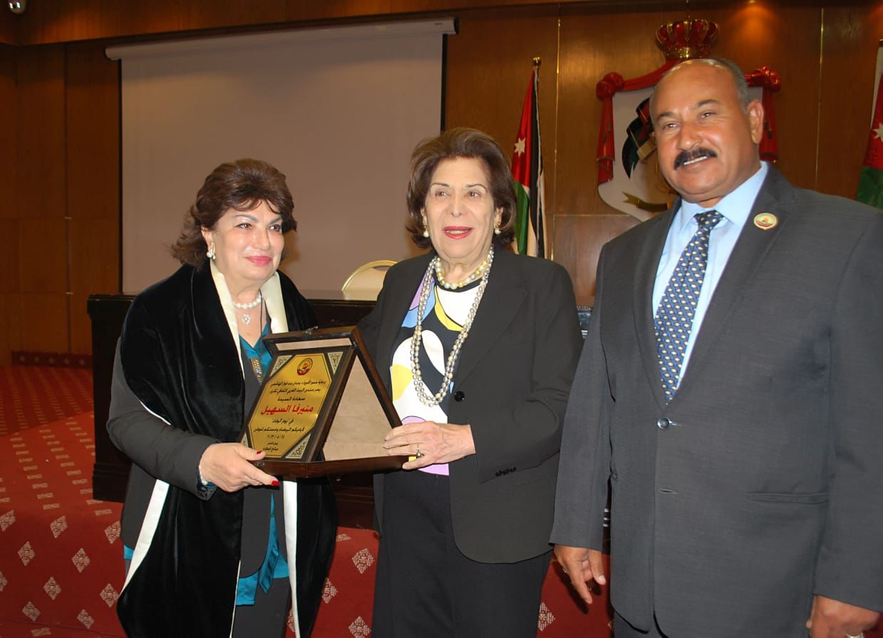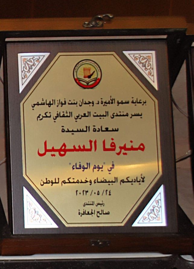 برعاية سمو الأميرة الدكتورة وجدان بنت فواز الهاشمي أقام منتدى البيت العربي الثقافي الأربعاء حفلا بعنوان “يوم الوفاء” تم فيه تكريم نخبة من سيدات المجتمع ممن لهم أياد بيضاء وأعمال تطوعية ومسيرة طويلة حافلة في الخدمة العامة والوطن، في المركز الثقافي الملكي، وبمشاركة الشعراء علي الفاعوري، محمد خضير، ومحمد بو عوني الطورة. السيدات المكرمات هن: القاضية تغريد حكمت، هيفاء البشير، نايفة الزبن، سناء الفاهوم، جولييت عواد، مريم العمري، منيرفا السهيل، زهرية الصعوب، شهيرة المجالي، جلوريا الربضي وميشلين المعلوف.