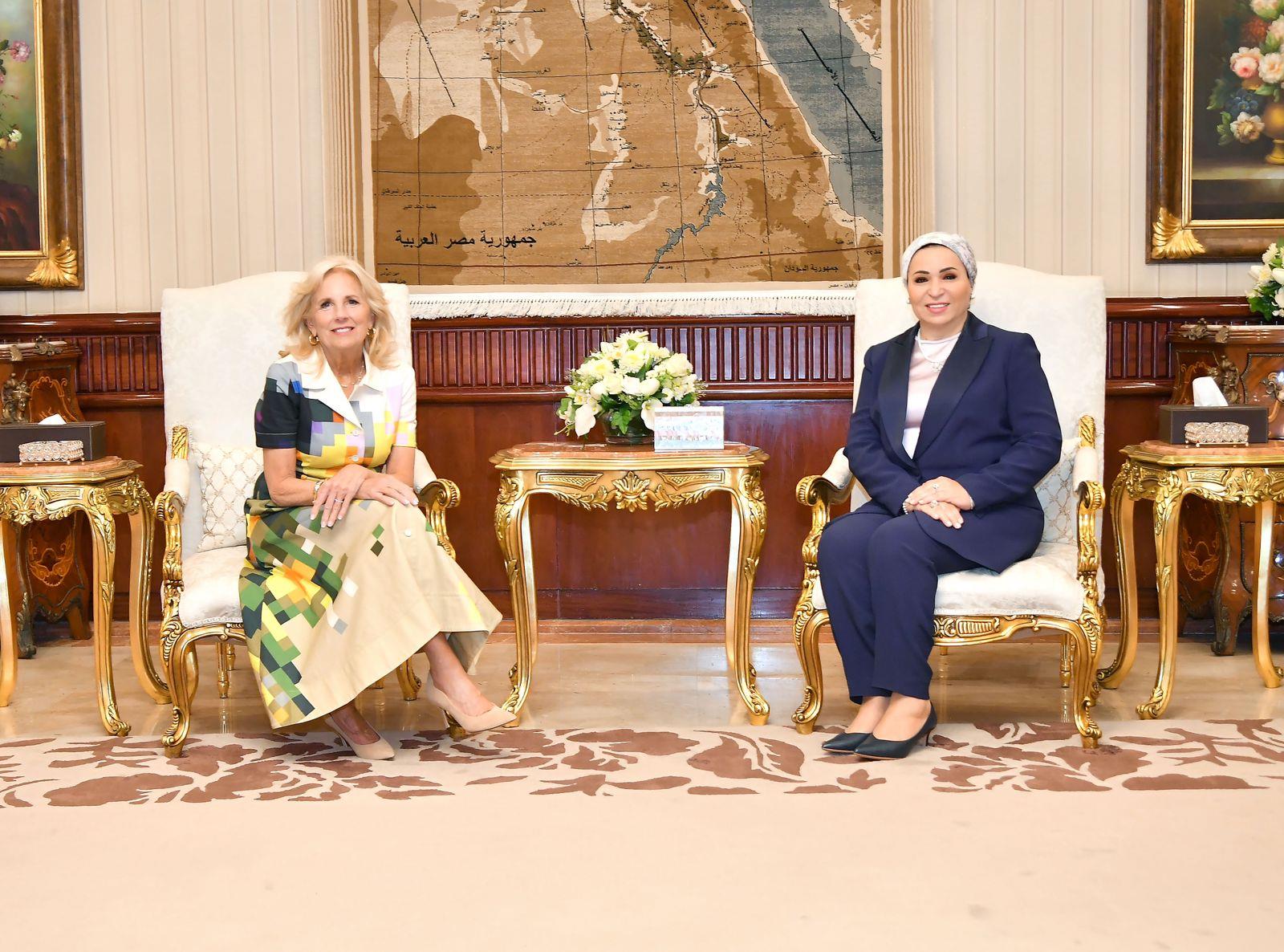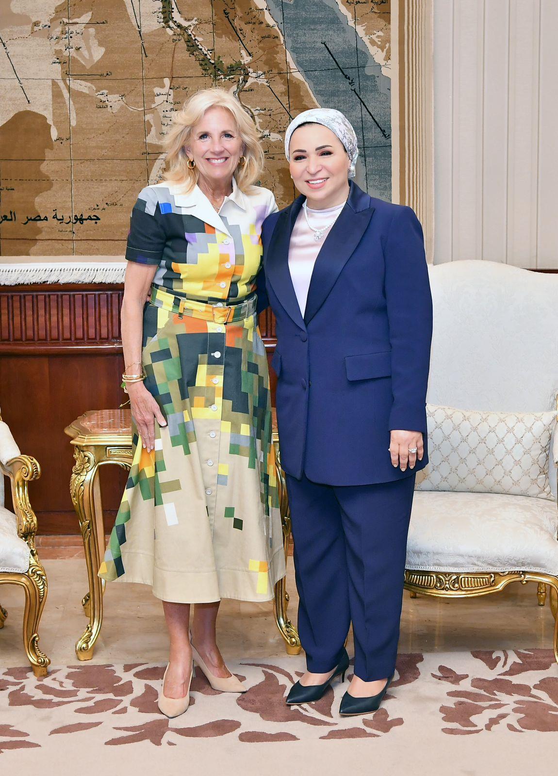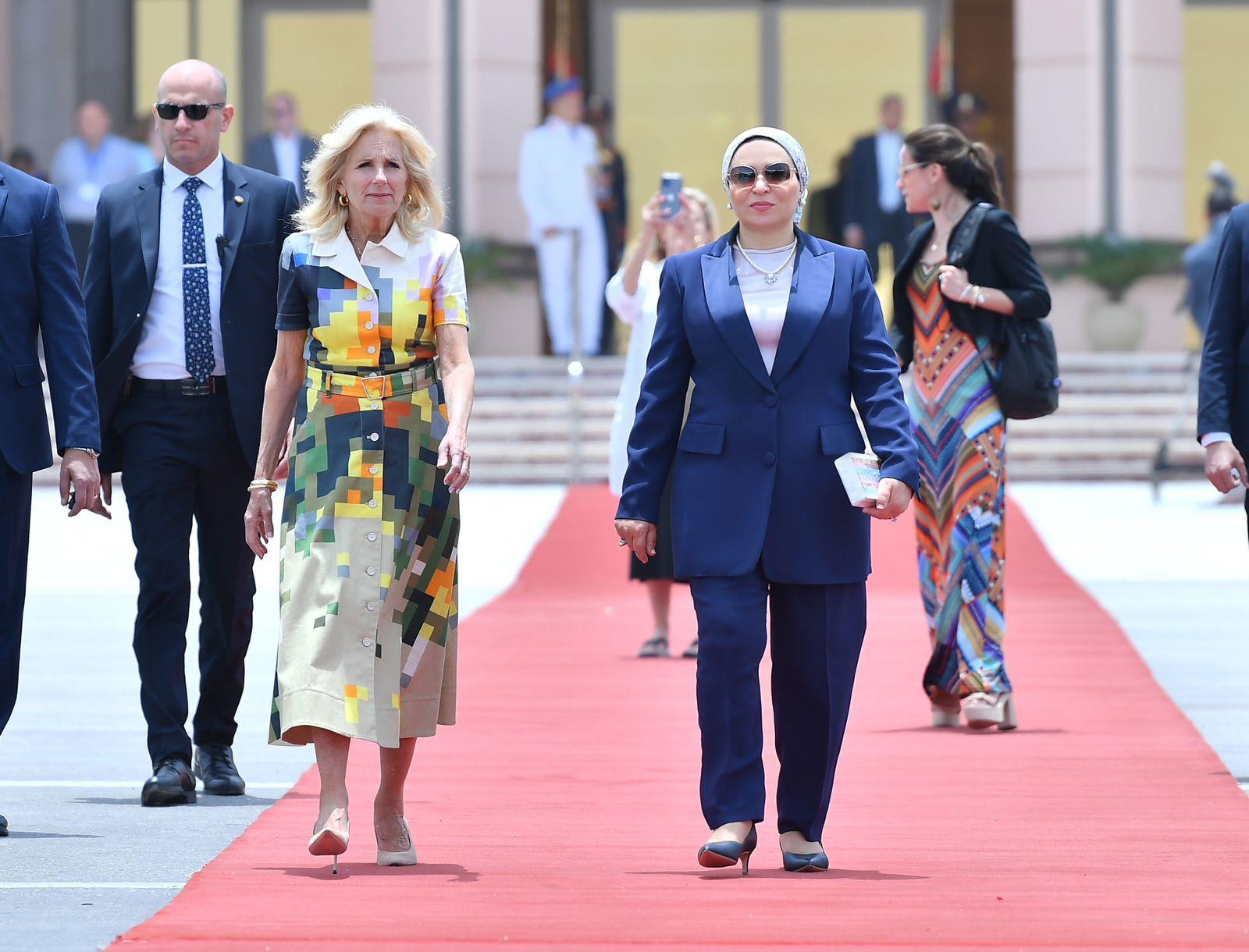 وكانت استقبلت السيدة انتصار السيسي، قرينة رئيس الجمهورية، جيل بايدن قرينة الرئيس الأمريكي، لدى وصولها إلى مصر، اليوم الجمعة، في المحطة الثانية لزيارتها للمنطقة والتي بدأتها بالأردن.