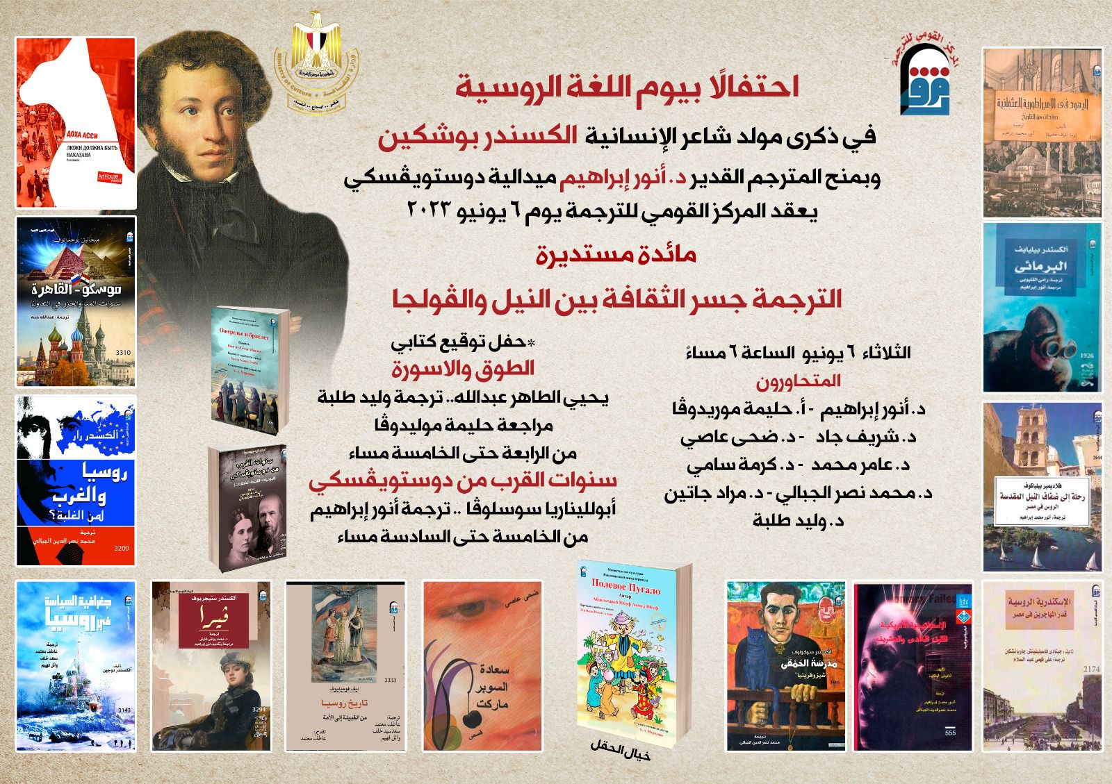 احتفالًا بيوم اللغة الروسية وبمنح المترجم القدير الدكتور أنور إبراهيم ميدالية دوستويڤسكي، يعقد المركز القومي للترجمة مائدة مستديرة بعنوان الترجمة.. جسر الثقافة بين النيل والڤولجا وذلك في تمام السادسة من مساء الثلاثاء ٦ يونيو بقاعة طه حسين بمشاركة كلٍ من: الدكتور أنور إبراهيم ،الأستاذة حليمة موريدوفا، الدكتور شريف جاد ،الدكتورة ضحى عاصي ،الدكتور عامر محمد،الدكتورة كرمة سامي، الدكتور محمد نصر الجبالي، الدكتور مراد جاتين والدكتور وليد طلبة.