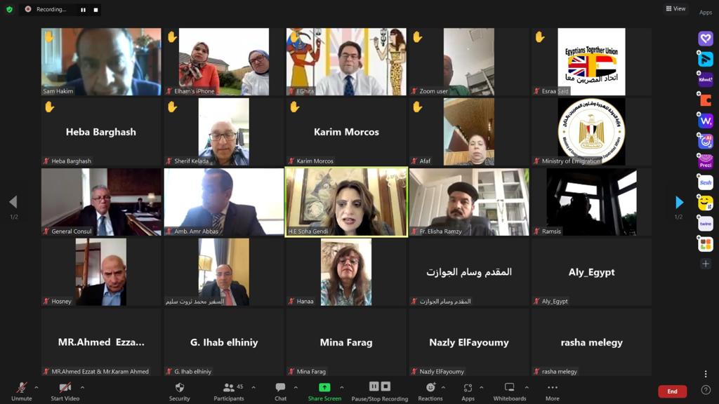جاء ذلك خلال لقاء افتراضي عقدته السفيرة سها جندي وزيرة الدولة للهجرة وشئون المصريين بالخارج، عبر الفيديو كونفرانس، مع 45 مصريا من رموز الجالية المصرية في جمهورية أيرلندا واسكتلندا وأيرلندا الشمالية، لمناقشة أوضاع الجالية والاستماع إلى أفكارهم وأطروحاتهم الخاصة بخلق مزيد من الربط بين أعضاء الجالية ووطنهم مصر خلال الفترة المقبلة، بما يلبي احتياجات المصريين في هذه الدول، وذلك بحضور السفير عمرو عباس مساعد وزيرة الهجرة لشئون الجاليات، والسفير محمد ثروت سليم، سفير مصر في أيرلندا، السفير محمد أبو الخير قنصل عام مصر في لندن.