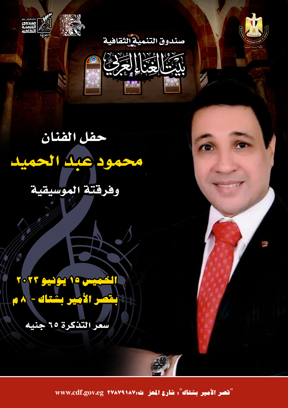 يقيم بيت الغناء العربى بقصر الأمير بشتاك التابع لقطاع صندوق التنمية الثقافية فى الثامنة مساء الخميس 15 يونيو 2023 حفلا غنائيا للمطرب محمود عبد الحميد.