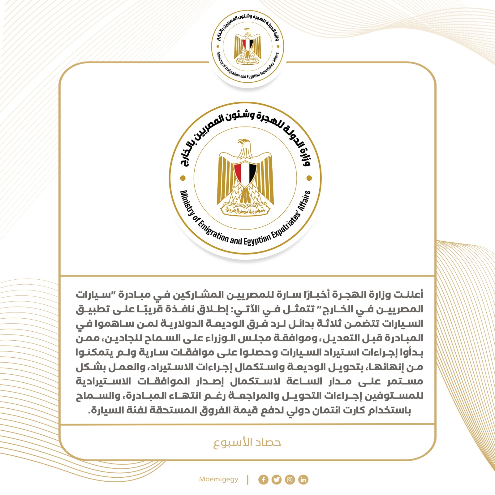 وأعلنت وزارة الهجرة أخبارًا سارة للمصريين المشاركين في مبادرة “سيارات المصريين في الخارج” تتمثل في الآتي: إطلاق نافذة قريبًا على تطبيق السيارات تتضمن ثلاثة بدائل لرد فرق الوديعة الدولارية لمن ساهموا في المبادرة قبل التعديل، وموافقة مجلس الوزراء على السماح للجادين، ممن بدأوا إجراءات استيراد السيارات وحصلوا على موافقات سارية ولم يتمكنوا من إنهائها، بتحويل الوديعة واستكمال إجراءات الاستيراد، والعمل بشكل مستمر على مدار الساعة لاستكمال إصدار الموافقات الاستيرادية للمستوفين إجراءات التحويل والمراجعة رغم انتهاء المبادرة، والسماح باستخدام كارت ائتمان دولي لدفع قيمة الفروق المستحقة لفئة السيارة.