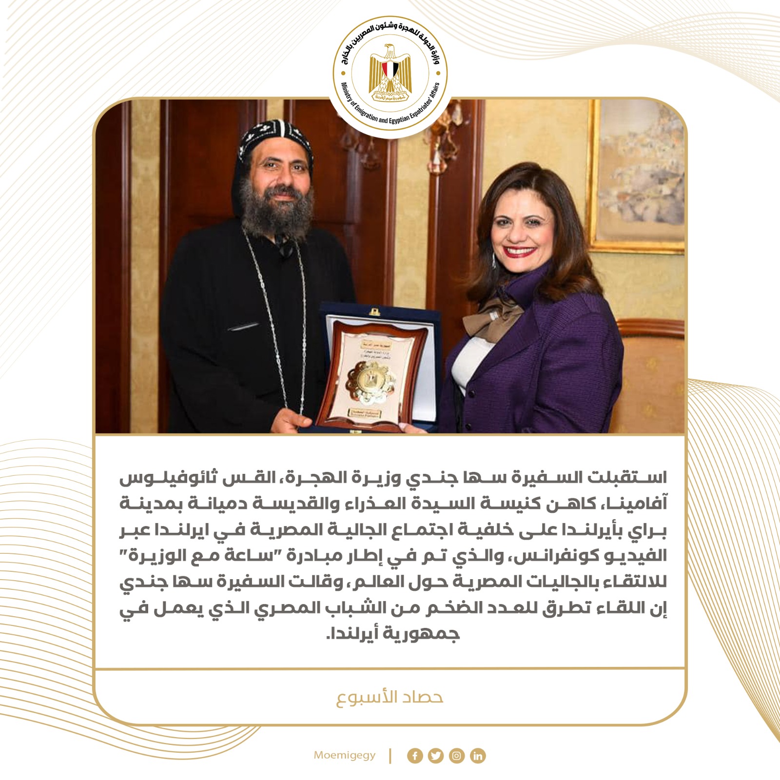 واستقبلت السفيرة سها جندي وزيرة الهجرة، القس ثائوفيلوس آفامينا، كاهن كنيسة السيدة العذراء والقديسة دميانة بمدينة براي بأيرلندا على خلفية اجتماع الجالية المصرية في أيرلندا عبر الفيديو كونفرانس، والذي تم في إطار مبادرة “ساعة مع الوزيرة” للالتقاء بالجاليات المصرية حول العالم، وقالت السفيرة سها جندي إن اللقاء تطرق للعدد الضخم من الشباب المصري الذي يعمل في جمهورية أيرلندا، وأن وزارة الهجرة يسعدها التواصل معهم من خلال مركز “ميدسي” لشباب المصريين في الخارج التابع لوزارة الهجرة، وتم الاتفاق على ترتيب اجتماع يتم الاستماع خلاله إلى أوضاع هذه المجموعات الهامة من الشباب ومحاولة الوصول إلى حلول لأي تحديات يواجهونها.