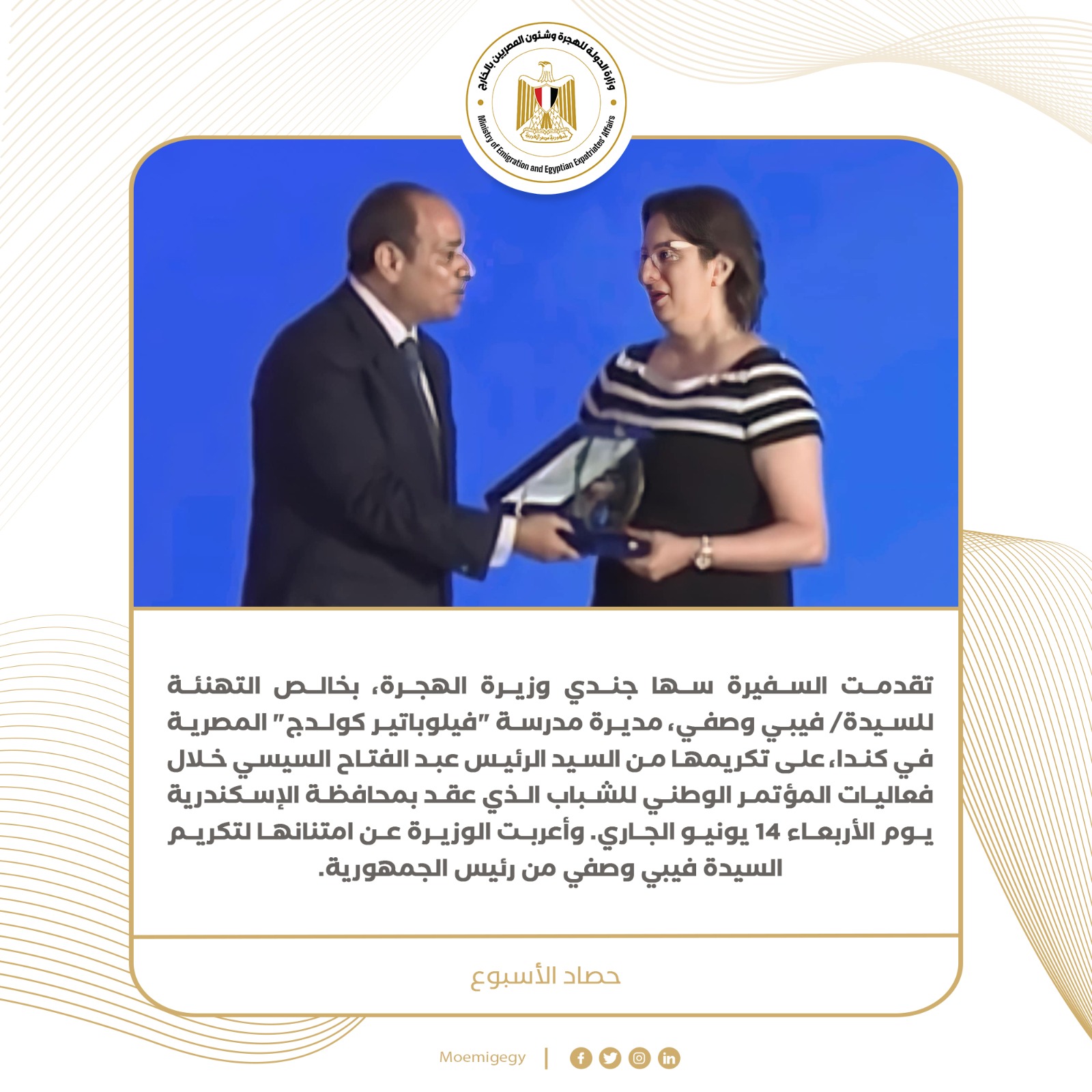 تقدمت السفيرة سها جندي وزيرة الهجرة، بخالص التهنئة الي/ فيبي وصفي، مديرة مدرسة “فيلوباتير كولدج” المصرية في كندا، على تكريمها من السيد الرئيس عبد الفتاح السيسي خلال فعاليات المؤتمر الوطني للشباب الذي عقد بمحافظة الإسكندرية يوم الأربعاء 14 يونيو الجاري. وأعربت الوزيرة عن امتنانها لتكريم السيدة فيبي وصفي من رئيس الجمهورية، وقالت: “إنها تبذل جهودًا تستحق عليها هذا التكريم فضلا عن اعتزازها الشديد بمصريتها، فهي نموذج ملهم ومصدر فخر للمرأة المصرية بالخارج وذات تأثير كبير في المجتمع الكندي، ودائما لها مواقف وطنية عديدة خاصة دورها في مساعدة المصريين بكندا أثناء جائحة كورونا، والمساهمة في دعم المشروع القومي العظيم (حياة كريمة) والترويج له خارجيًا”.