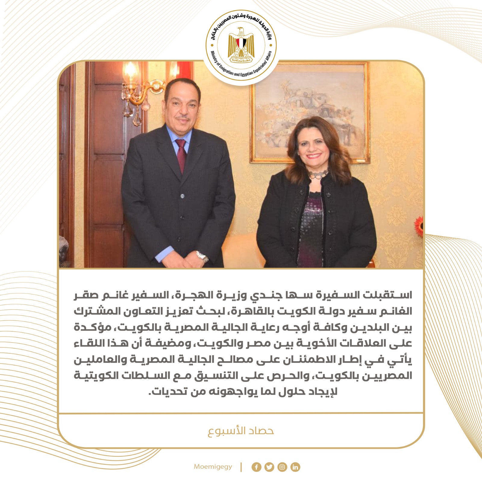 واستقبلت السفيرة سها جندي وزيرة الهجرة، السفير غانم صقر الغانم سفير دولة الكويت بالقاهرة، لبحث تعزيز التعاون المشترك بين البلدين وكافة أوجه رعاية الجالية المصرية بالكويت، مؤكدة على العلاقات الأخوية بين مصر والكويت، ومضيفة أن هذا اللقاء يأتي في إطار الاطمئنان على مصالح الجالية المصرية والعاملين المصريين بالكويت، والحرص على التنسيق مع السلطات الكويتية لإيجاد حلول لما يواجهونه من تحديات. وقد تم الاتفاق على استمرار التنسيق بين وزارة الهجرة وسفارتي البلدين لإيجاد حلول والنظر في الطلبات المقدمة من المصريين بالكويت بشأن القضايا المعلقة وذلك في إطار التعاون المستمر والتقدير المتبادل.