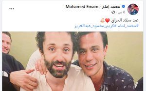 وشارك محمد امام، عبر حسابه الرسمي بموقع التواصل الإجتماعى «فيس بوك»، صورة تجمعة بكريم محمود عبدالعزيز، وعلق عليها قائلا: «عيد ميلاد الحراق».