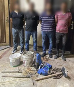 عقب تقنين الإجراءات تم إستهداف الورشة المُشار إليها وأمكن ضبط (مالك الورشة ، و 3 أشخاص آخرين “لإثنين منهم معلومات جنائية”).. حال قيامهم بالتنقيب عن الآثار داخل الورشة المُشار إليها ، وعُثر بداخلها على (حفرة قطرها 1,5 × 1,5متر بعمق 2 متر – أدوات حفر وتنقيب) ، وبمواجهتهم أقر أحدهم بالإستعانة بباقى المتهمين للقيام بأعمال الحفر بقصد التنقيب عن الآثار ، وبمواجهتهم أيدوا ذلك.