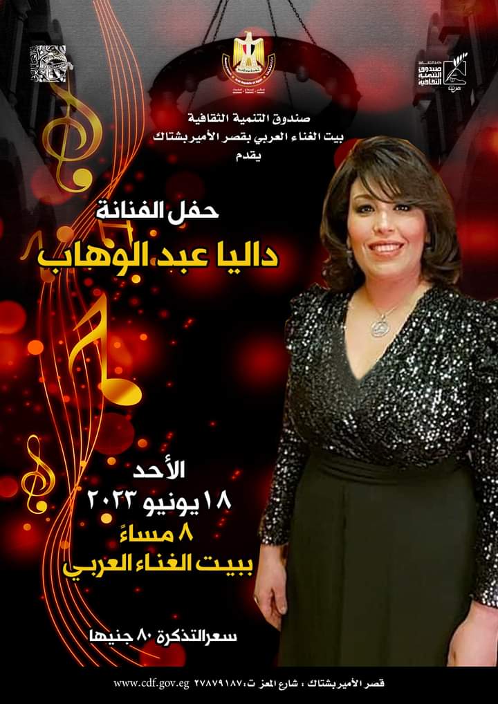 كما يقيم قصر الأمير بشتاك التابع لقطاع صندوق التنمية الثقافية فى الثامنة مساء اليوم الأحد 18 يونيو 2023 حفل غنائى للفنانة داليا عبد الوهاب وفرقتها الموسيقية .