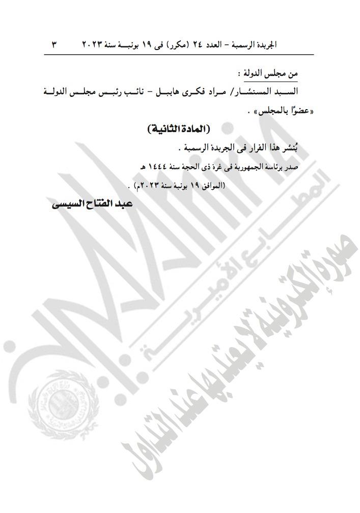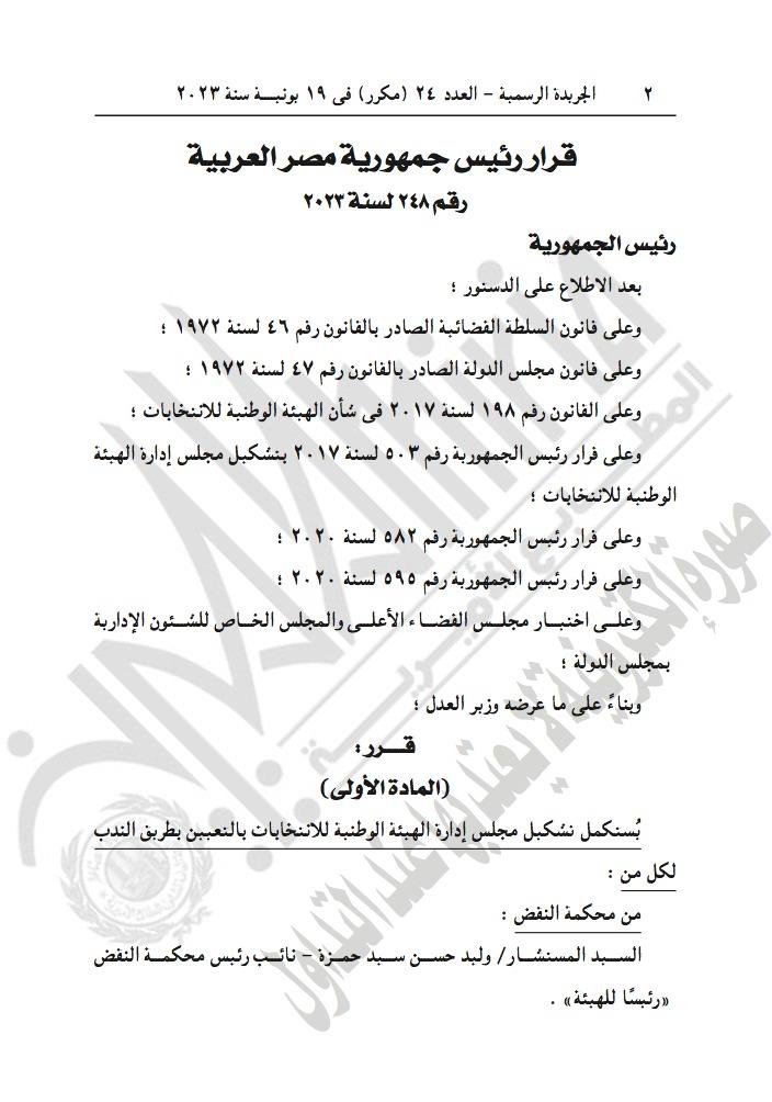 نشرت الجريدة الرسمية في عددها رقم 24 (مكرر)، الصادر في 19 يونيو 2023، قرار جمهوري للرئيس عبد الفتاح السيسي رقم 248 لسنة 2023، بشأن استكمال تشكيل الهيئة الوطنية للانتخابات