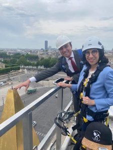 وكتب السفير المصري في فرنسا ” تشريف جديد بتمثيل بلدى فى يوم تاريخى لتركيب قمة الهرم الذهبى أعلى المسلة المصرية فى ميدان الكونكورد (على ارتفاع ٢٣ مترا) بعد اعمال الترميم التى شهدتها على مدى الشهور الماضية “.