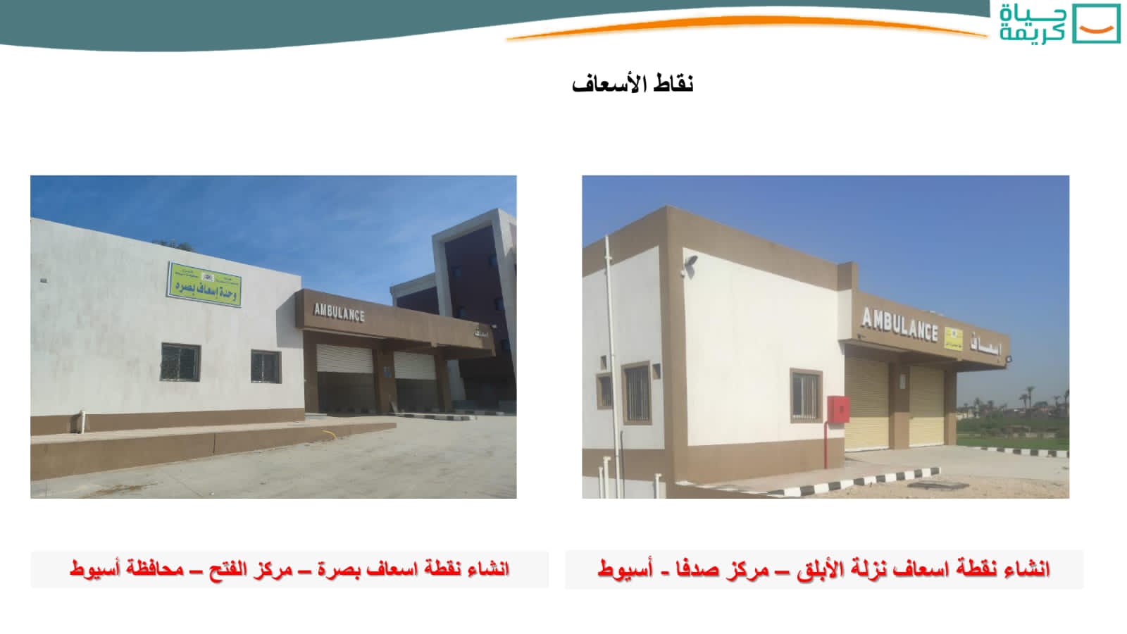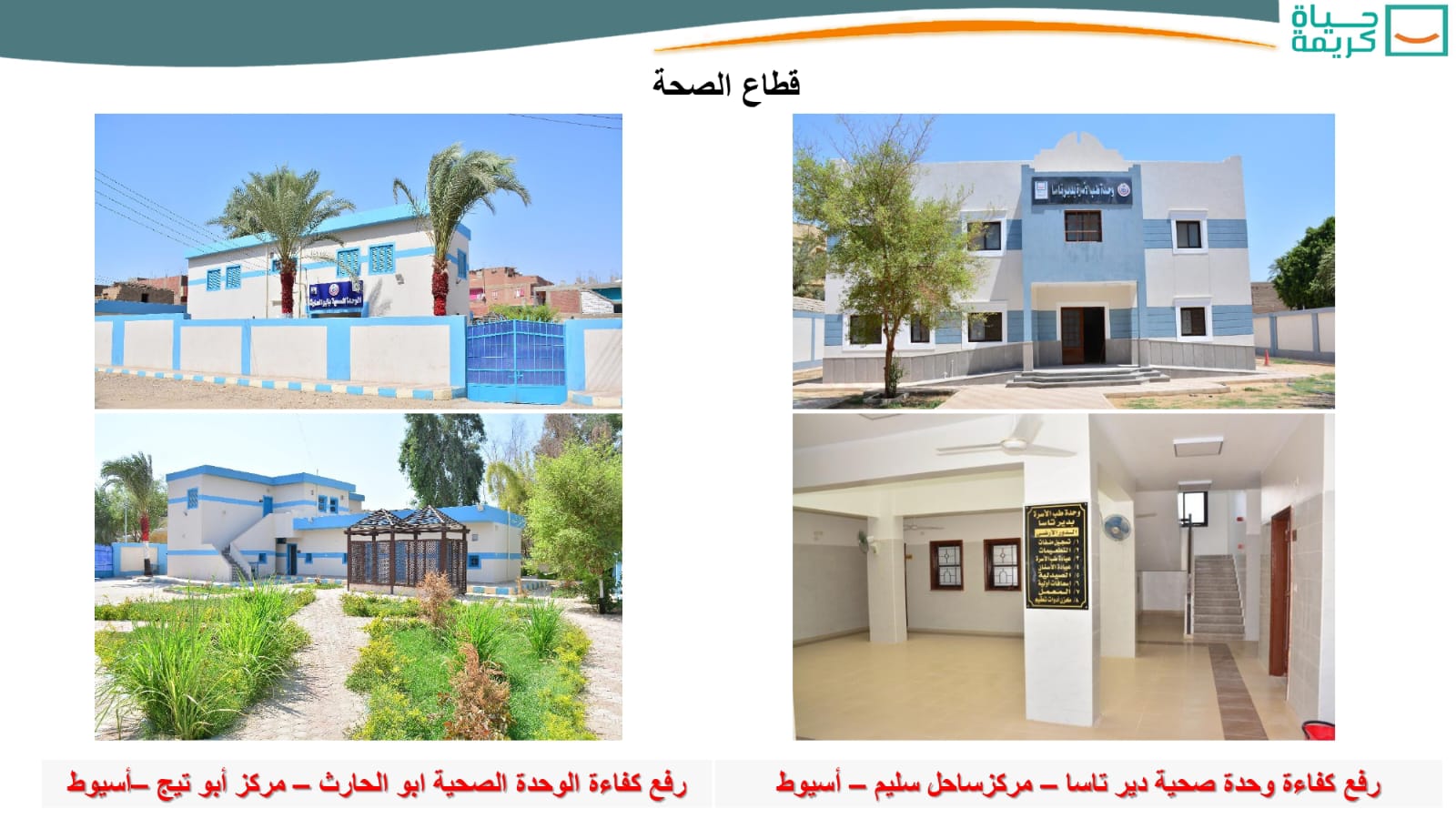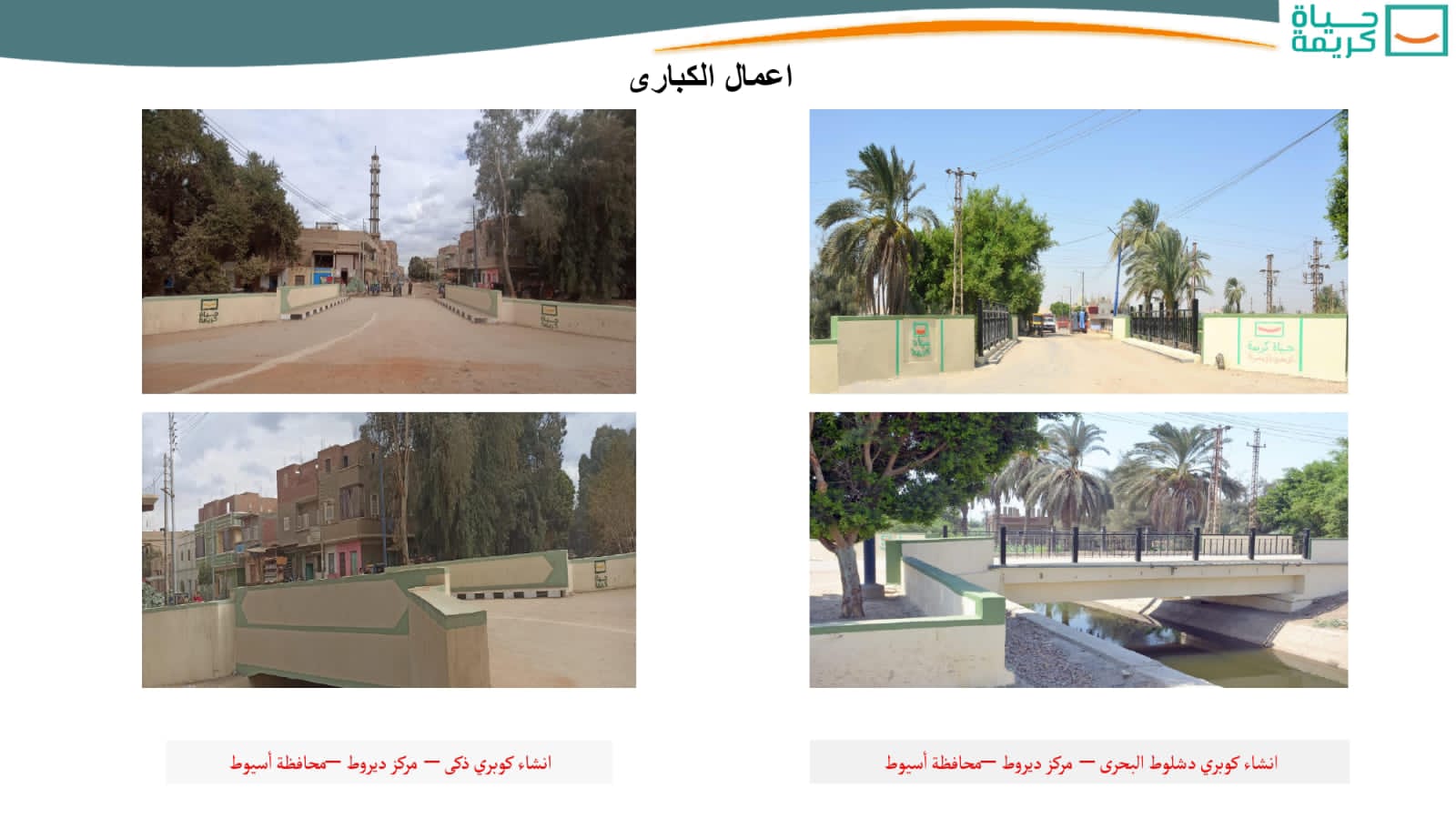 وأشار اللواء محمود نصار، إلى أن مشروعات “حياة كريمة” بمحافظة أسيوط، تشمل أيضاً، إنشاء ورفع كفاءة خفيف لـ98 (وحدة / مركز صحي – تم إنهاء 21 مشروعاً) طبقاً لمنظومة التأمين الصحى الشامل، للارتقاء بالمنظومة الصحية والخدمات الطبية المُقدمة للمواطنين، وتم الانتهاء من الأعمال بـ38 نقطة إسعاف من إجمالى 39 نقطة إسعاف (إنشاء – تطوير ورفع كفاءة)، لتحسين خدمات الإسعاف المقدمة للمواطنين، بجانب انتهاء الأعمال بـ167 كوبرى على المجارى المائية، من إجمالى 171 كوبرى (إنشاء – إحلال وتجديد – تطوير ورفع كفاءة)، بالتنسيق مع المختصين من وزارة الرى بما يحقق تنفيذ الأعمال المطلوبة، وعدم تأثر المجارى المائية بهذه الأعمال، وتحقق الكبارى الربط المطلوب بين أجزاء القرية الواحدة وبين القرى وبعضها.