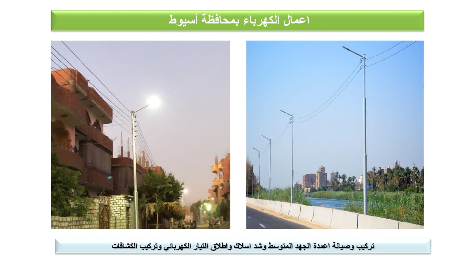 وقال اللواء محمود نصار، رئيس الجهاز المركزى للتعمير: تضم المشروعات المخططة والجارى تنفيذها حاليا بمحافظة أسيوط ضمن المبادرة الرئاسية “حياة كريمة”، أعمال تطوير وتدعيم شبكات الكهرباء والإنارة العامة بـ153 قرية، لتحسين الخدمات المُقدمة للمواطنين، حيث تم إنهاء الأعمال وإطلاق التيار فى 56 قرية، وجارٍ إنهاء تنفيذ الأعمال بـ87 قرية، موضحاً أنه تم التنسيق مع وزارة الكهرباء والطاقة المتجددة لتحديد أعمال الكهرباء المطلوبة بالقرى، وتشمل، تأهيل شبكات الجهد المتوسط القائمة بإحلال المتهالك منها، وتغيير المحولات الهوائية إلى محولات داخل أكشاك صاج أو غرف، ورفع قدرات المحولات لتتناسب مع الأحمال الفعلية، وتغيير كابلات الجهد المتوسط والمنخفض لتتناسب مع الأحمال الفعلية، وتأهيل شبكات الجهد المنخفض القائمة بإحلال المتهالك منها، ورفع كفاءة شبكة الخطوط الهوائية وتغيير ما يلزم، إضافة إلى أعمال الإنارة العامة.