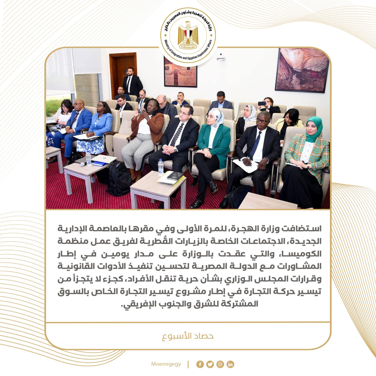 8) استضافت وزارة الهجرة، للمرة الأولى وفي مقرها بالعاصمة الإدارية الجديدة، الاجتماعات الخاصة بالزيارات القُطرية لفريق عمل منظمة الكوميسا، والتي عقدت بالوزارة على مدار يومين في إطار المشاورات مع الدولة المصرية لتحسين تنفيذ الأدوات القانونية وقرارات المجلس الوزاري بشأن حرية تنقل الأفراد، كجزء لا يتجزأ من تيسير حركة التجارة في إطار مشروع تيسير التجارة الخاص بالسوق المشتركة للشرق والجنوب الإفريقي. وقد رحبت السفيرة سها جندي وزيرة الهجرة، بكل أعضاء فريق عمل الكوميسا، وممثلي الجهات الوطنية المصرية، وأكدت على أن الدولة المصرية منذ أن انضمت إلى تجمع دول الكوميسا في عام ١٩٩٨، فإنها قد بذلت الكثير من الجهود بهدف زيادة معدلات التعاون الاقتصادي وتفعيل التكامل الإقليمي بين دول الكوميسا.