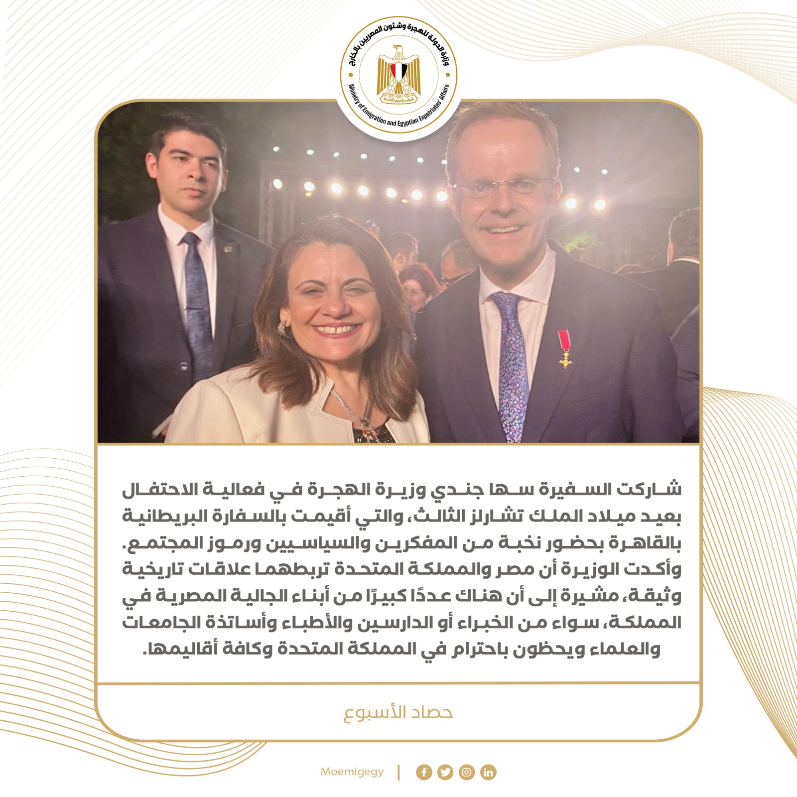 7) شاركت السفيرة سها جندي وزيرة الهجرة في فعالية الاحتفال بعيد ميلاد الملك تشارلز الثالث، والتي أقيمت بالسفارة البريطانية بالقاهرة بحضور نخبة من المفكرين والسياسيين ورموز المجتمع. وأكدت الوزيرة أن مصر والمملكة المتحدة تربطهما علاقات تاريخية وثيقة، مشيرة إلى أن هناك عددًا كبيرًا من أبناء الجالية المصرية في المملكة، سواء من الخبراء أو الدارسين والأطباء وأساتذة الجامعات والعلماء ويحظون باحترام في المملكة المتحدة وكافة أقاليمها.