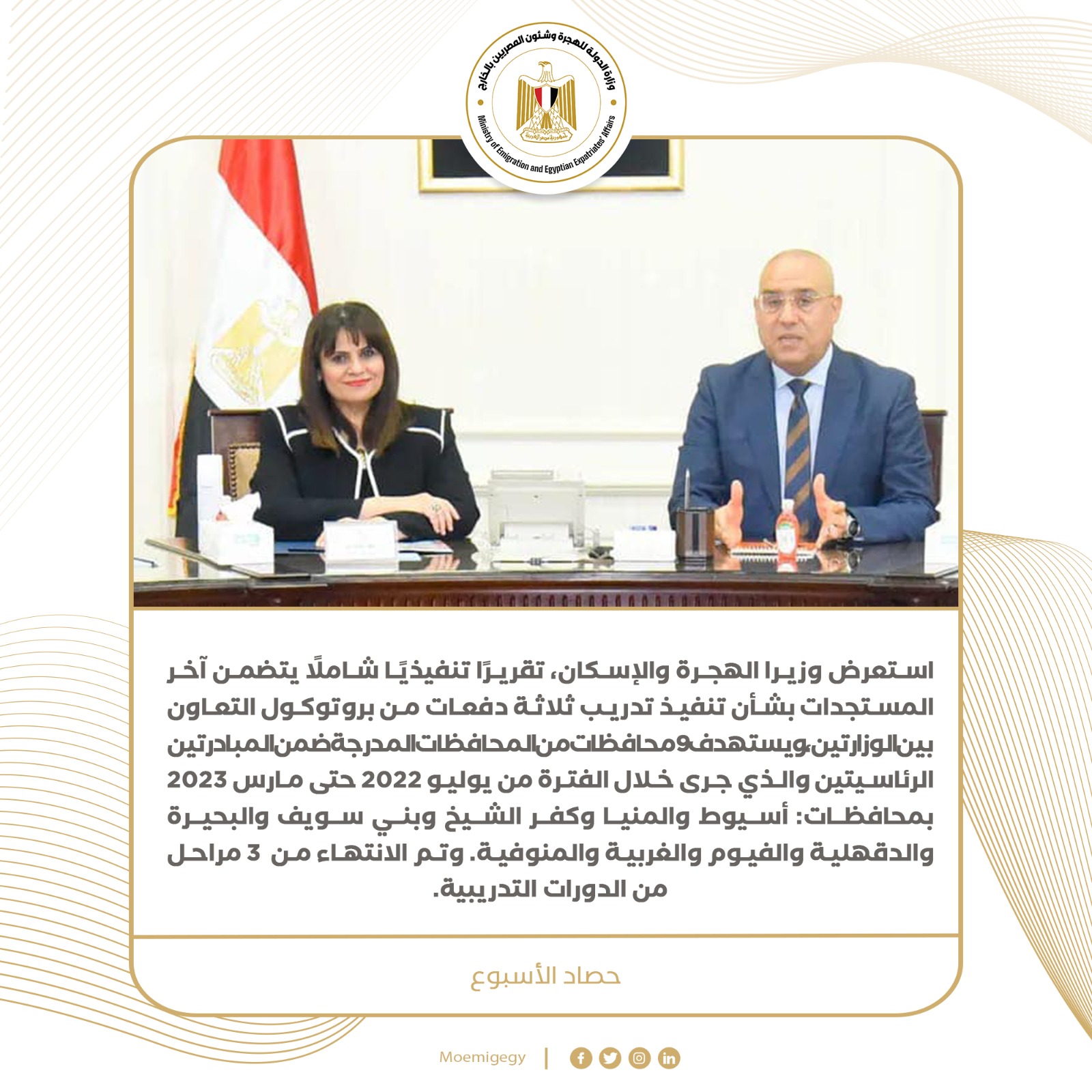 6) في إطار بروتوكول التعاون الموقع بين وزارة الدولة للهجرة وشئون المصريين بالخارج، ووزارة الإسكان والمرافق والمجتمعات العمرانية، لرفع الوعي المجتمعي وتعزيز المشاركة لسكان القرى الأولى بالرعاية في إطار تنفيذ المبادرتين الرئاسيتين “مراكب النجاة” و”حياة كريمة”، استعرض وزيرا الهجرة والإسكان، تقريرًا تنفيذيًا شاملًا يتضمن آخر المستجدات بشأن تنفيذ تدريب ثلاثة دفعات من بروتوكول التعاون والذي يستهدف 9 محافظات من المحافظات المدرجة ضمن المبادرتين الرئاسيتين والذي جرى خلال الفترة من يوليو 2022 حتى مارس 2023 بمحافظات: أسيوط والمنيا وكفر الشيخ وبني سويف والبحيرة والدقهلية والفيوم والغربية والمنوفية. وأعلنت السفيرة سها جندي وزيرة الهجرة انتهاء 3 مراحل من الدورات التدريبية، فيما صرح د. عاصم الجزار وزير الإسكان بأنه خلال البرنامج التدريبي تم تدريب 1815 شابا من هذه المحافظات بمراكز تدريب “المركزي للتعمير” و”القابضة للمياه والصرف”.