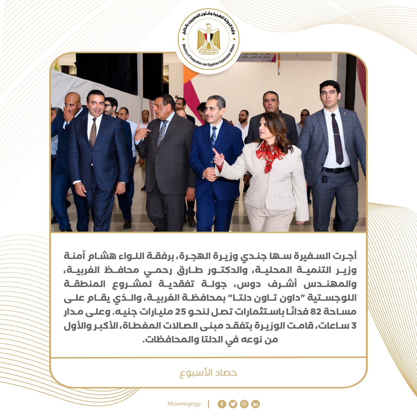 5) أجرت السفيرة سها جندي وزيرة الهجرة، برفقة اللواء هشام آمنة وزير التنمية المحلية، والدكتور طارق رحمي محافظ الغربية، والمهندس أشرف دوس، جولة تفقدية لمشروع المنطقة اللوجستية “داون تاون دلتا” بمحافظة الغربية، والذي يقام على مساحة 82 فدانًا باستثمارات تصل لنحو 25 مليارات جنيه. وعلى مدار 3 ساعات، قامت الوزيرة بتفقد مبنى الصالات المغطاة، الأكبر والأول من نوعه في الدلتا والمحافظات، والمكون من خمسة طوابق ويتضمن صالات تدريب على الألعاب الفردية والجماعية وصالات الفنون لتعليم الموسيقى والرسم، حيث أشادت سيادتها بالفكر المتطور وراء إنشاء هذه الصالات ثم أدارت حوارًا مع الأطفال المتواجدين في مختلف القاعات.