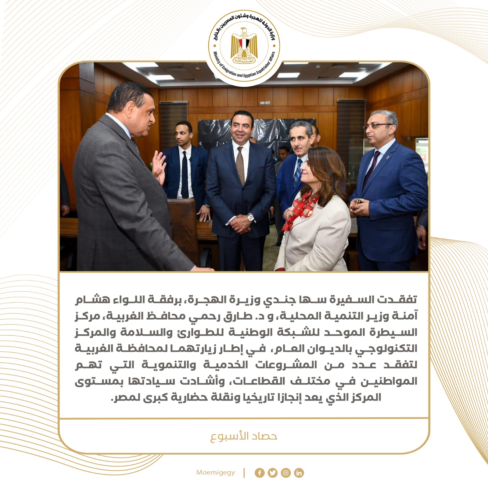 4) تفقدت السفيرة سها جندي وزيرة الهجرة، برفقة اللواء هشام آمنة وزير التنمية المحلية، و د. طارق رحمي محافظ الغربية، مركز السيطرة الموحد للشبكة الوطنية للطوارئ والسلامة والمركز التكنولوجي بالديوان العام، وذلك في إطار زيارتهما لمحافظة الغربية لتفقد عدد من المشروعات الخدمية والتنموية التي تهم المواطنين في مختلف القطاعات، حيث أشادت سيادتها بمستوى المركز الذي يعد إنجازا تاريخيا ونقلة حضارية كبرى لمصر في التعامل مع الأزمات والطوارئ من خلال منظومة واحدة تشارك فيها جميع الوزارات والهيئات ودواوين المحافظات بالدولة.